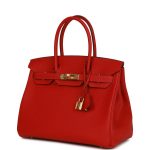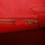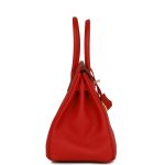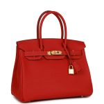 This Special Order (HSS) Birkin is in Rouge Casaque togo leather with gold hardware and has tonal stitching, front flap, two straps with center toggle closure, clochette with lock and two keys, and double rolled handles.