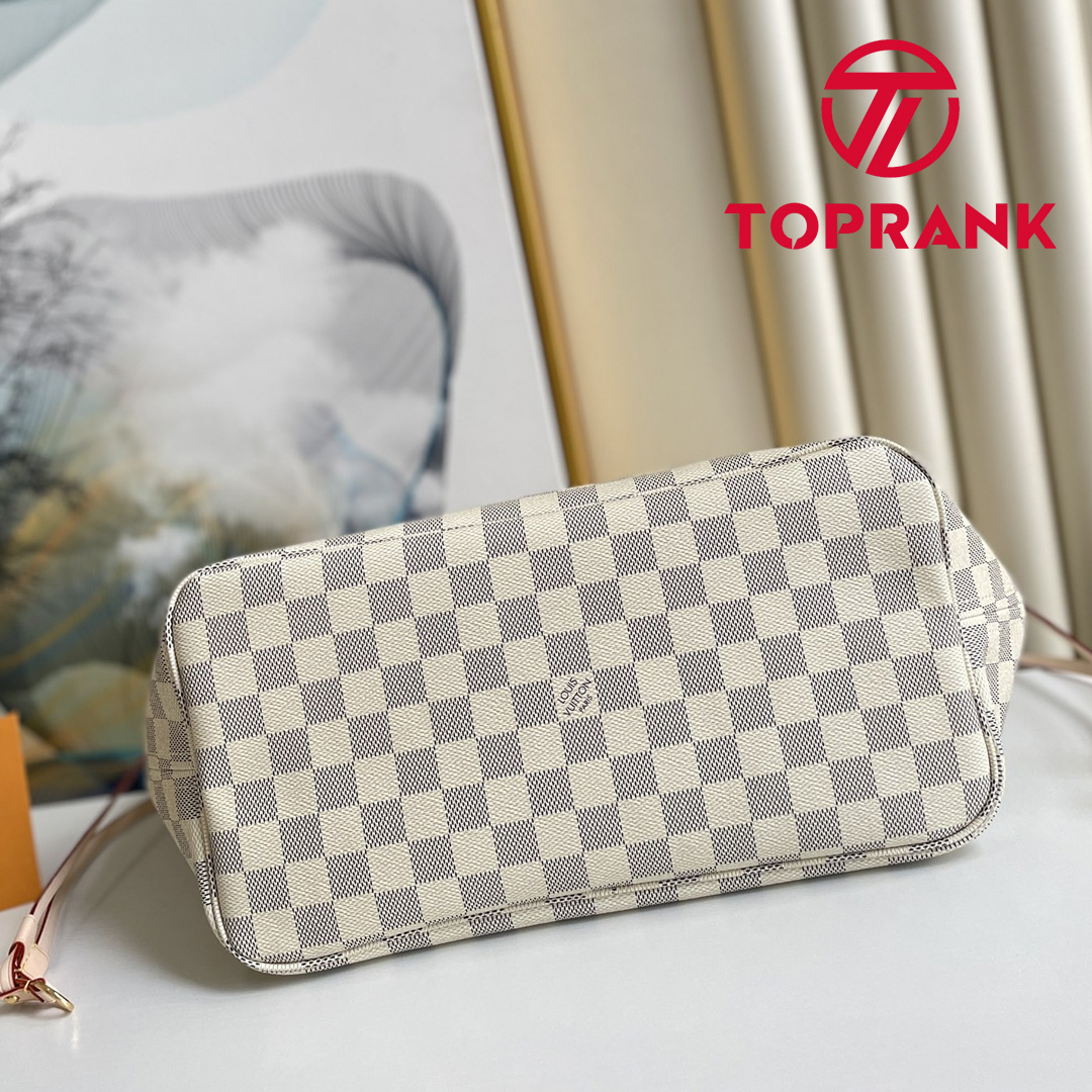 The Neverfull PM tote pairs timeless design with heritage details. Crafted from Damier Azur canvas with natural cowhide trim, it is capacious yet not bulky, with side laces that cinch for a sleek allure or loosen for a casual look. Slim, comfortable handles slip easily over the shoulder or arm. Lined in colorful textile, it features a removable pouch which can be used as a clutch or an extra pocket.