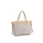 The Neverfull PM tote pairs timeless design with heritage details. Crafted from Damier Azur canvas with natural cowhide trim, it is capacious yet not bulky, with side laces that cinch for a sleek allure or loosen for a casual look. Slim, comfortable handles slip easily over the shoulder or arm. Lined in colorful textile, it features a removable pouch which can be used as a clutch or an extra pocket.