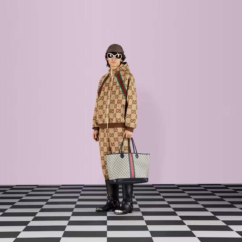 House collections continue the idea that pieces should be timeless and not just in fashion for one season. Guccio Gucci’s everlasting monogram continues to enrich new designs with a logo feel. This Ophidia tote bag is presented in a beige and blue variation of the historical GG Supreme canvas, complete with the Web stripe.
