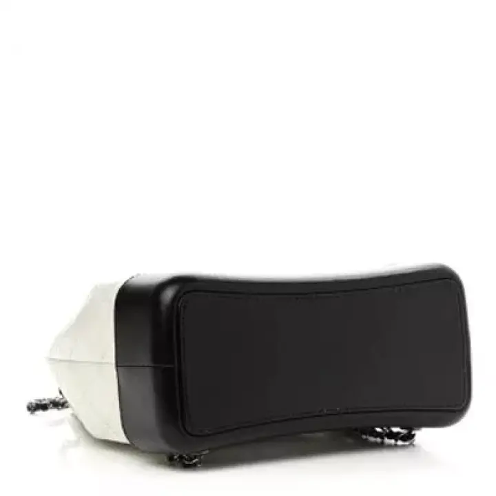 This is an authentic CHANEL Aged Calfskin Quilted Gabrielle Backpack in Black and White. This chic backpack is crafted of diamond-stitched textured aged white calfskin leather. The shoulder bag features a smooth black leather base, a ruthenium CC logo, ruthenium aged, polished gold and silver chain threaded leather shoulder straps, and an open top. This opens to a spacious deep red fabric interior with a patch pocket.