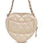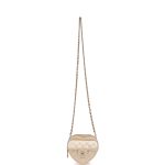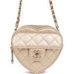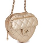 This CC In Love Heart Clutch with Chain is in pink lambskin leather with light gold tone hardware and features a front flap with signature CC turnlock closure, half moon back pocket, zip top closure and an interwoven light gold tone chain link and pink leather shoulder strap.