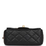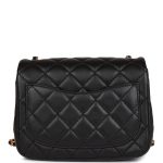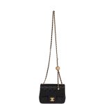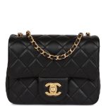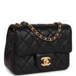 This Pearl Crush Mini Square flap bag is of black lambskin with antique gold tone hardware and has a front flap with signature CC turnlock closure, rear half moon pocket, single interwoven black leather and antique gold tone chain link shoulder/crossbody strap with adjustable “pearl” ball.