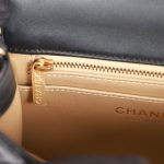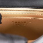 The interior is lined in gold leather and features a zipper pocket with Chanel pull and an open pocket below.