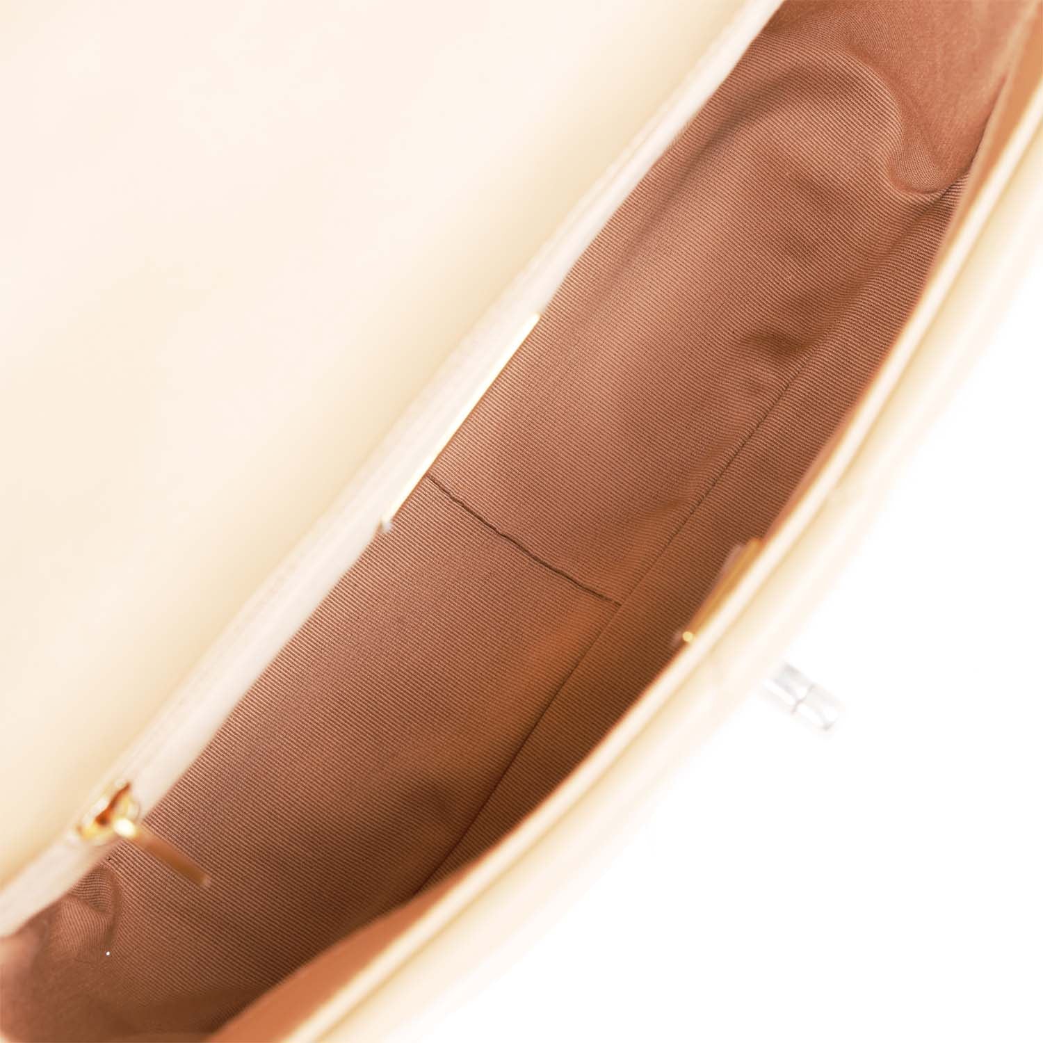 The interior is lined in beige fabric with one zip pocket on the rear wall.