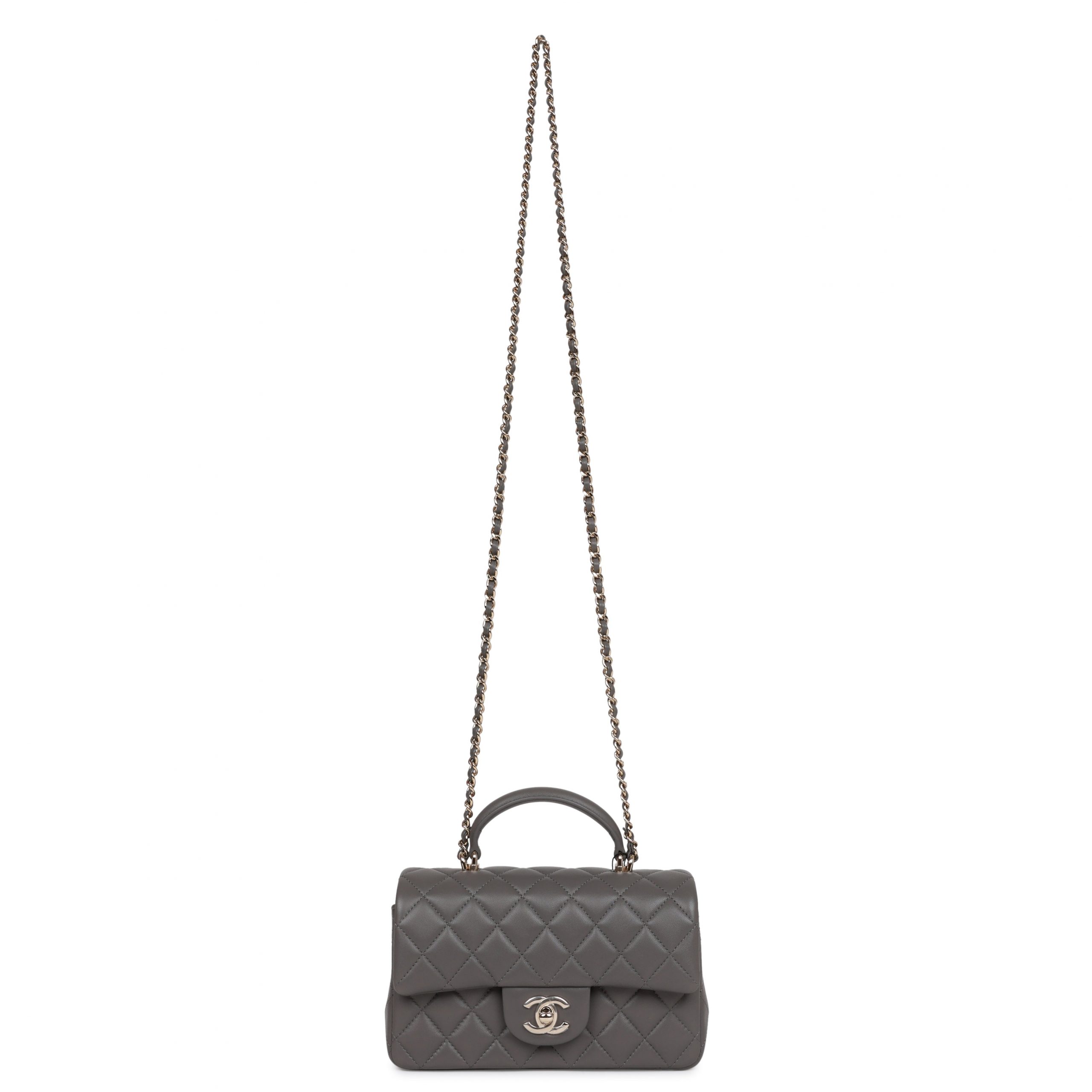 This Mini Rectangular flap bag is in dark grey lambskin with light gold tone hardware and has a front flap with signature CC turnlock closure, rear half moon pocket, top handle and single interwoven dark grey leather and light gold tone chain link shoulder/crossbody strap.