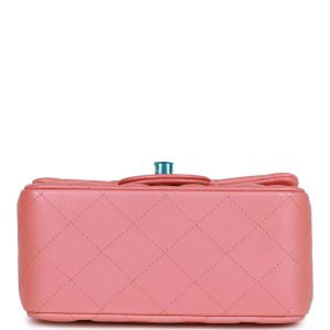 This Mini Square flap bag is in pink iridescent lambskin with silver tone hardware and has a front flap with signature CC turnlock closure, rear half moon pocket and single interwoven pink leather and silver tone chain link shoulder/crossbody strap.