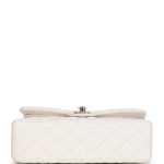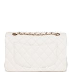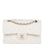 This Small Classic Double Flap bag is in?white caviar leather with light gold tone hardware and features a front flap with signature CC turnlock closure, half moon back pocket, and adjustable interwoven light gold tone chain link and?white leather shoulder strap.