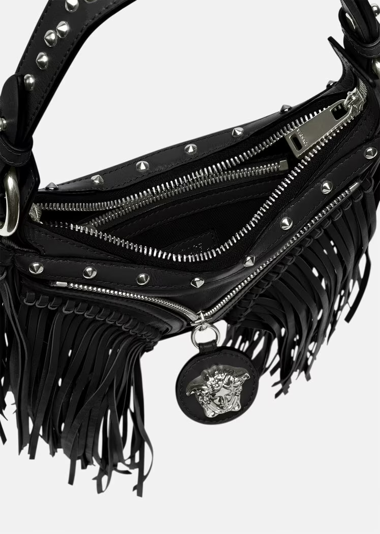 A mini edition of the hobo silhouette, the Repeat shoulder bag is made from leather with hand-knotted fringed trims and features a detachable shoulder strap. Biker-inspired, a Medusa charm puller and diagonal zippers add a grunge attitude with a Versace edge.