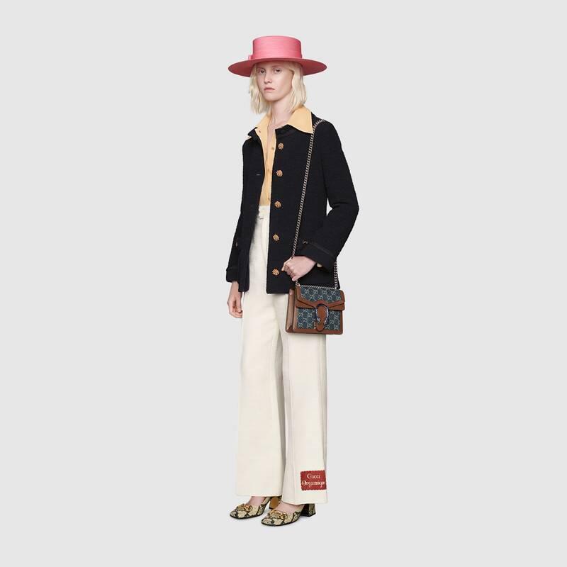 The Dionysus mini bag, crafted in Double G jacquard eco-wash denim, is a powerful addition to the Epilogue collection. The handbag continues the brand’s design concept of using new methods to interpret classic elements, cleverly incorporating bright blue enamel details in the collection’s iconic tiger head lock, which contrasts with the dark tones of the denim fabric. Contrasting-tone leather piping adds glamour to the overall design.