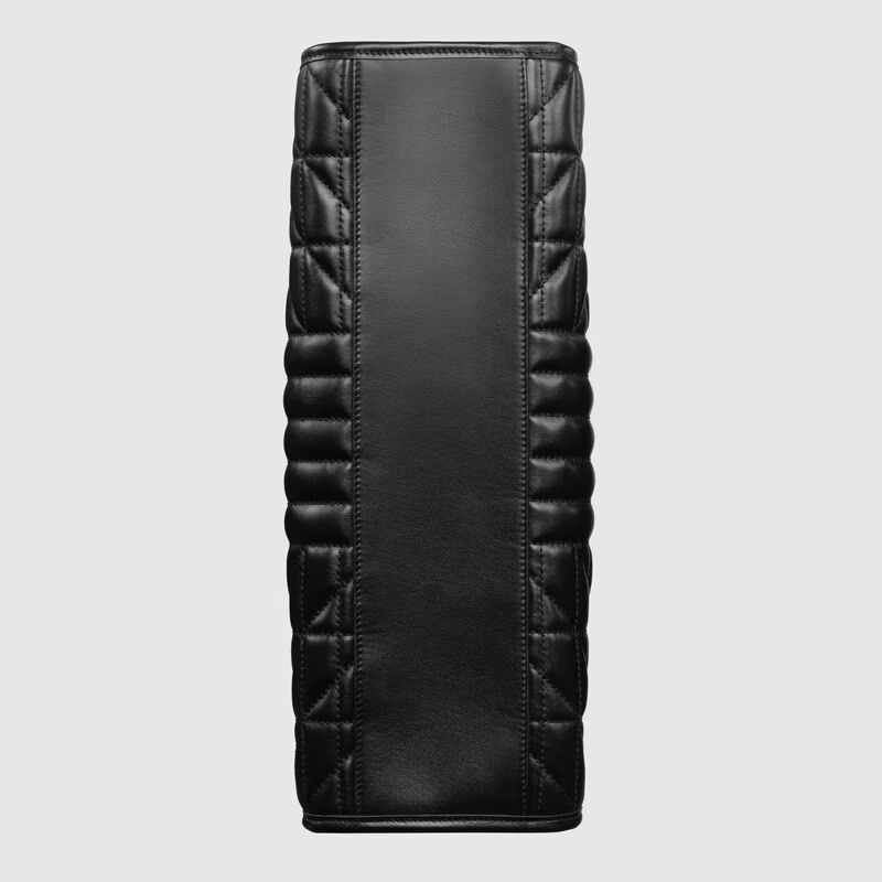 Gucci Aria explores the House’s archives, telling Gucci’s story though a mix of archival and contemporary elements. The GG Marmont was introduced in one of the Creative Director’s first fashion shows and each season its design evolves through the lens of the latest collection. Here, the tote bag is presented in black matelassé leather with antique silver-toned hardware.