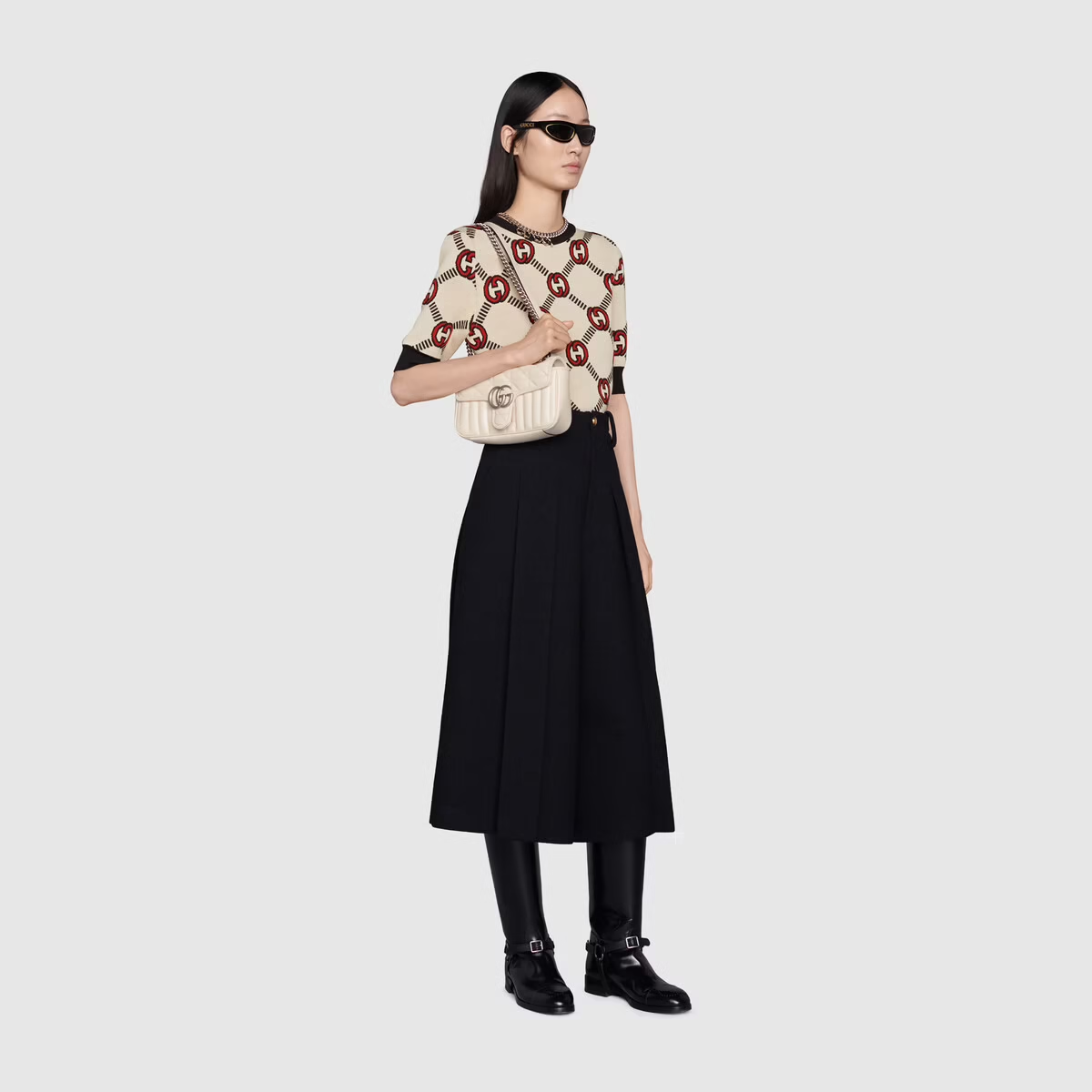 The Gucci Aria collection is an exploration of the House’s most emblematic codes and symbols. The GG Marmont is synonymous with its matelassé leather and monogram hardware. Here, the mini shoulder bag is reimagined with a new geometric take on its signature finish that combines vertical and diagonal motifs.