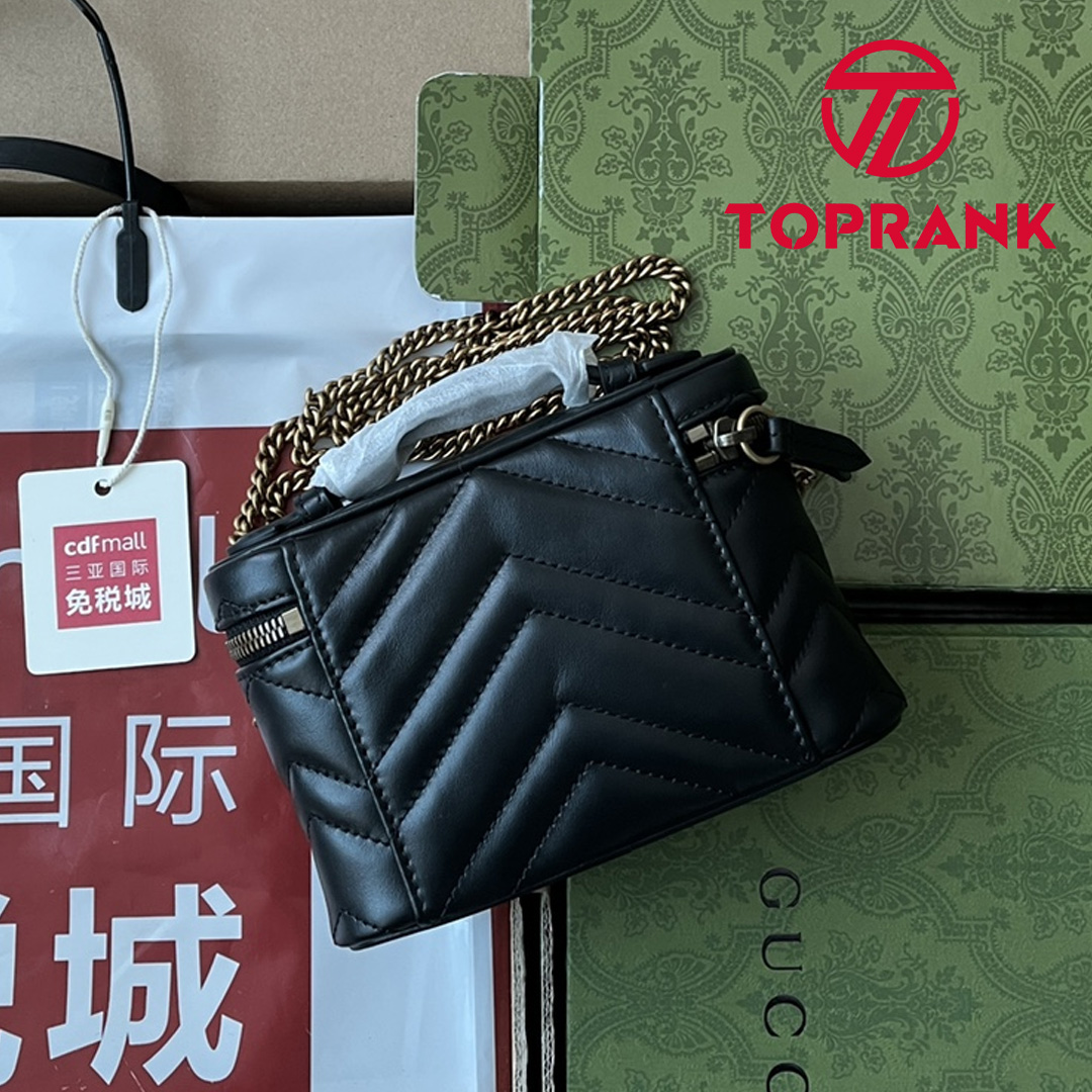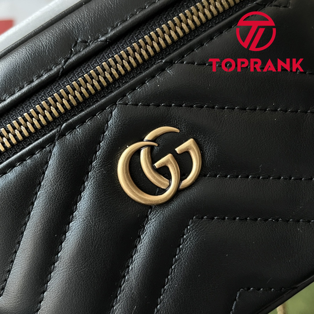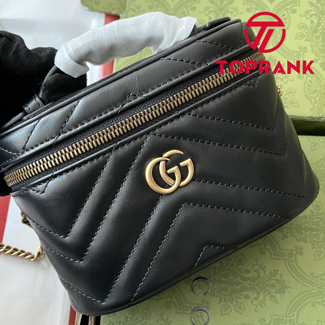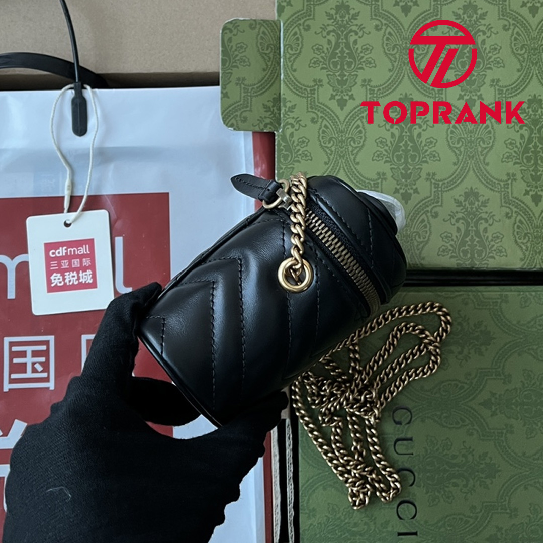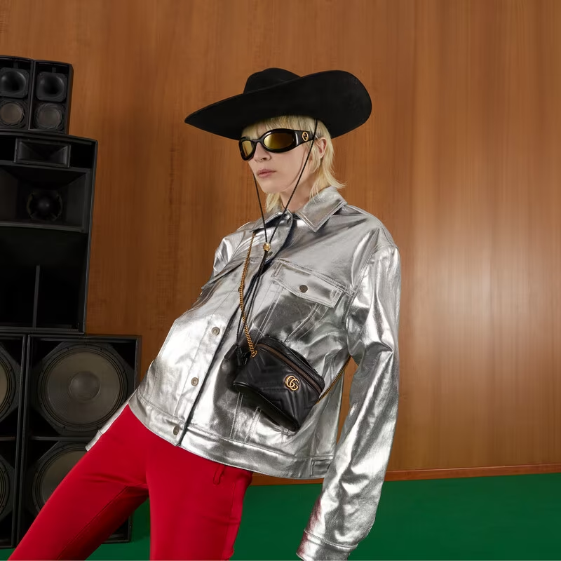 A zip around mini bag with a top handle is presented within the GG Marmont collection. Crafted from the line’s signature matelassé chevron leather in black, the rounded shape is enriched with the Double G detail. Featuring a detachable chain strap, the accessory can be styled in different ways.
