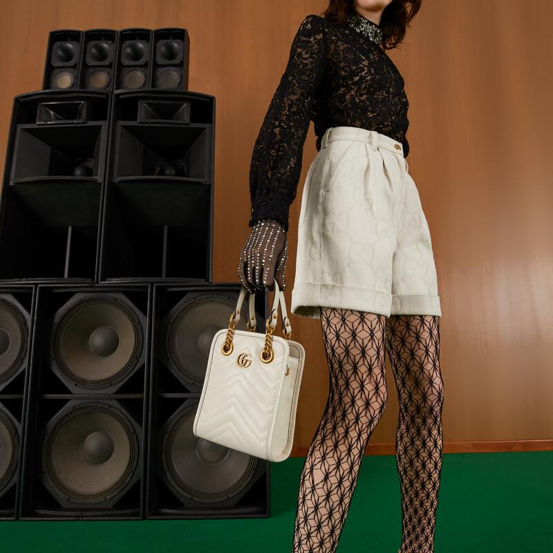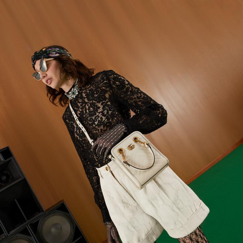 “Gucci’s March of Love” new fashion series interprets many of the brand’s recognizable elements into a mini version of the design, reproducing the trend of the 90s. Crafted in white quilted leather, this GG Marmont bag combines a soft yet structured rectangular shape with a noble and small Double G hardware. Double handles and a detachable leather shoulder strap add more styling options to the entire bag.