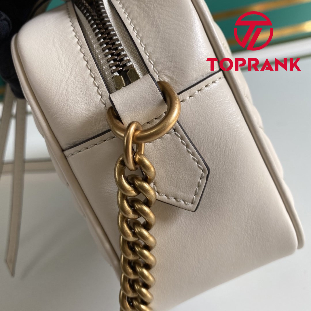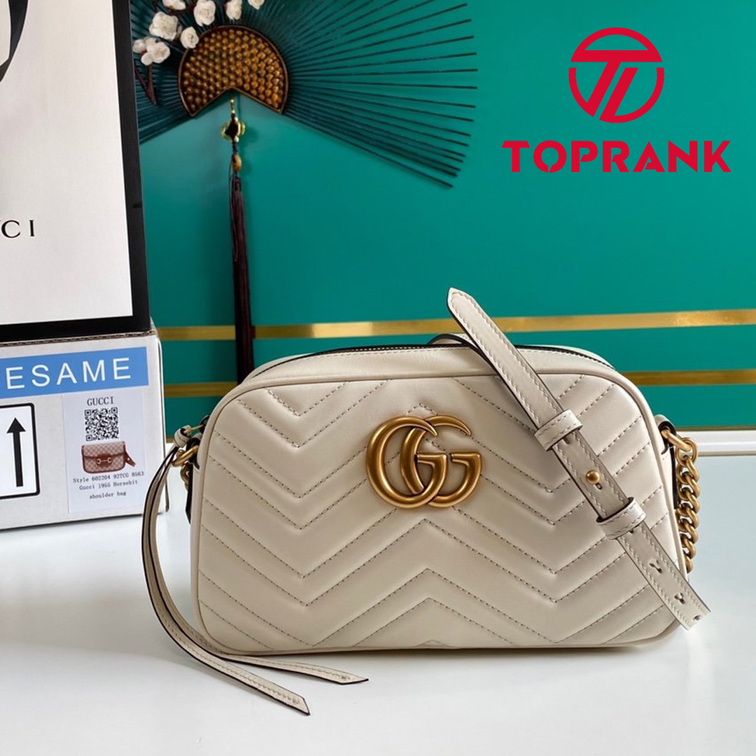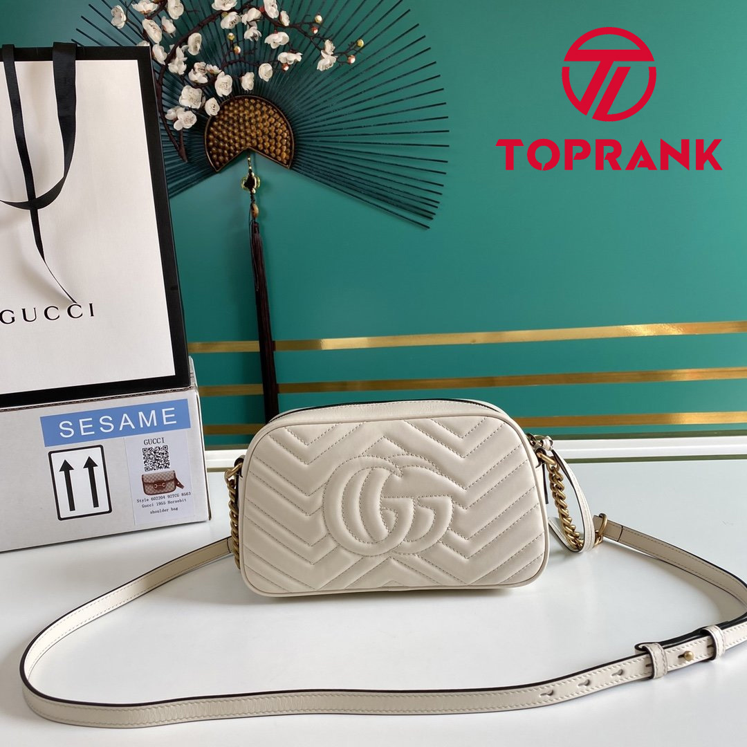 The small GG Marmont chain shoulder bag has a softly structured shape and a zip top closure with the Double G hardware. The chain shoulder strap has a leather shoulder detail. Made in matelassé leather with a chevron design and GG on the back.