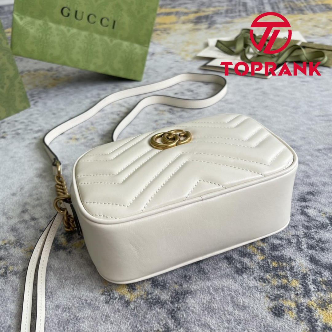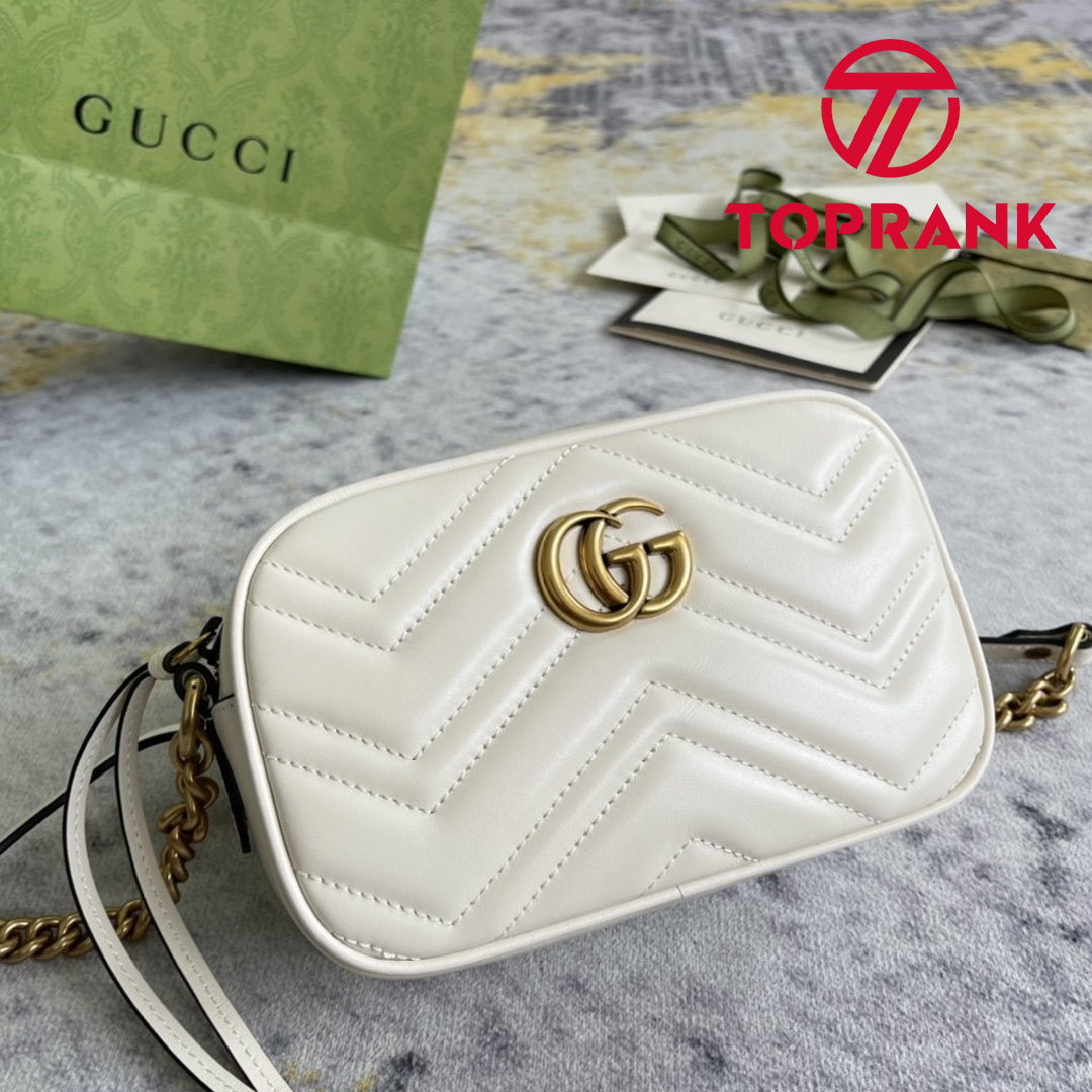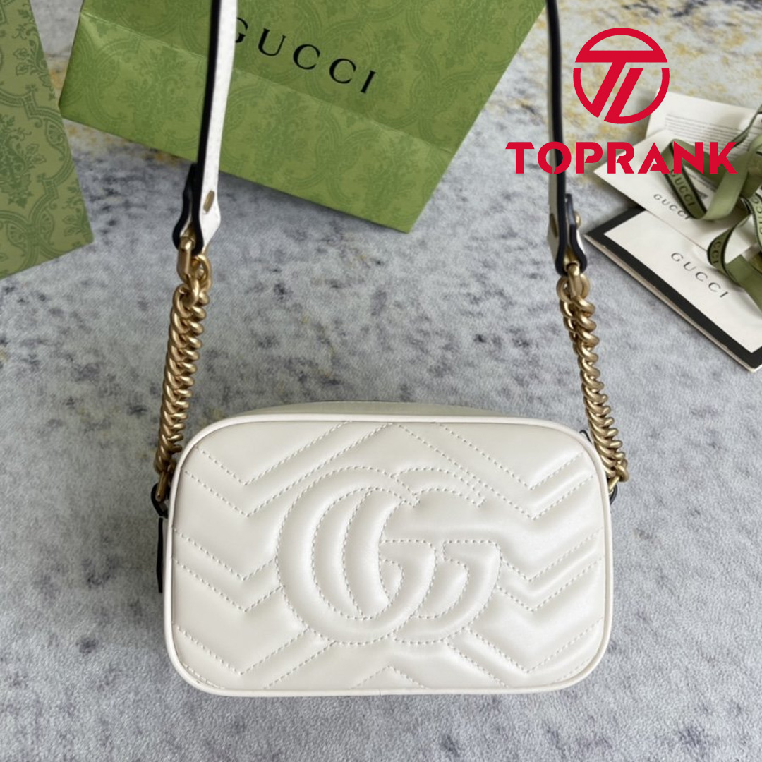 The small GG Marmont chain shoulder bag has a softly structured shape and a zip top closure with the Double G hardware. The chain shoulder strap has a leather shoulder detail. Made in matelassé leather with a chevron design and GG on the back.