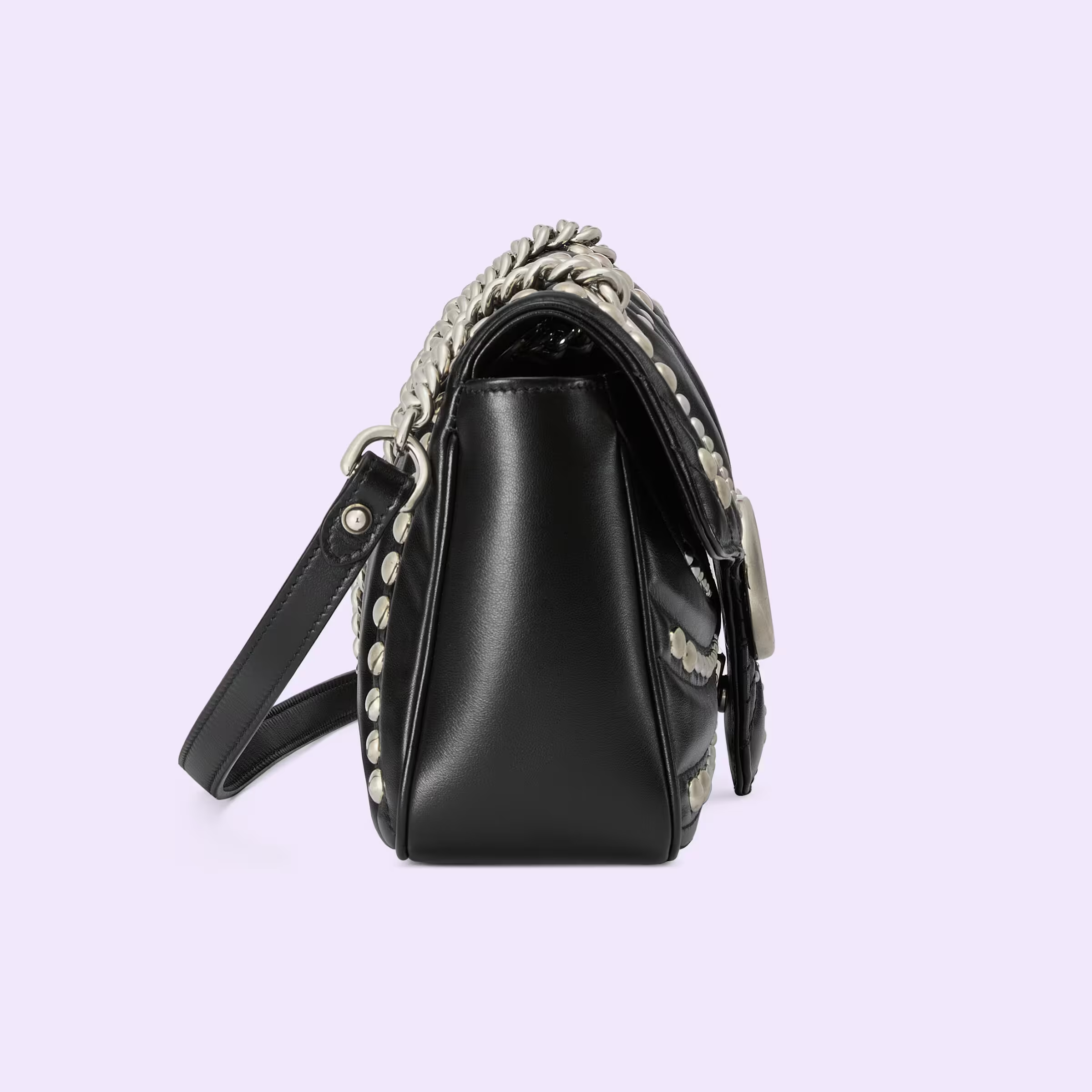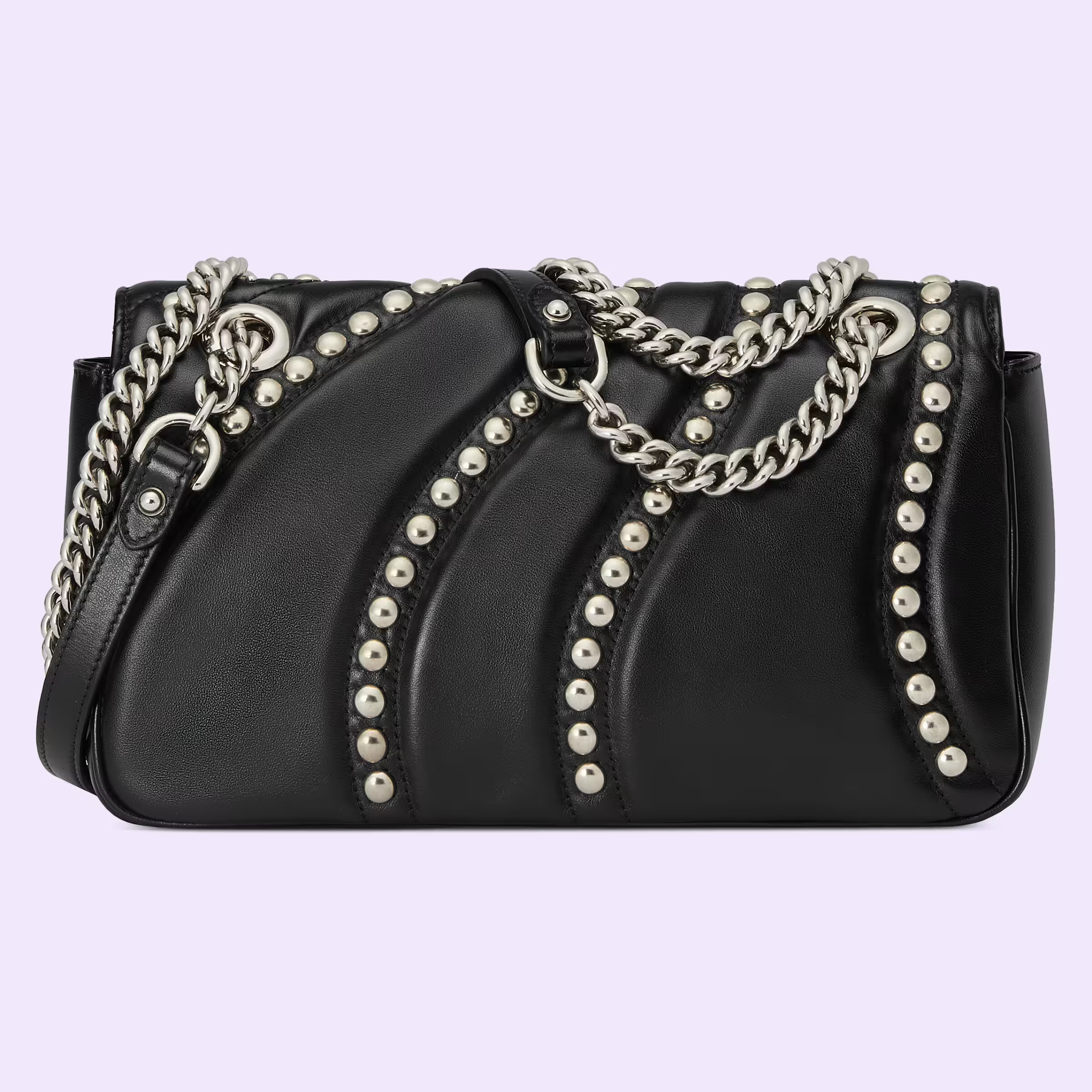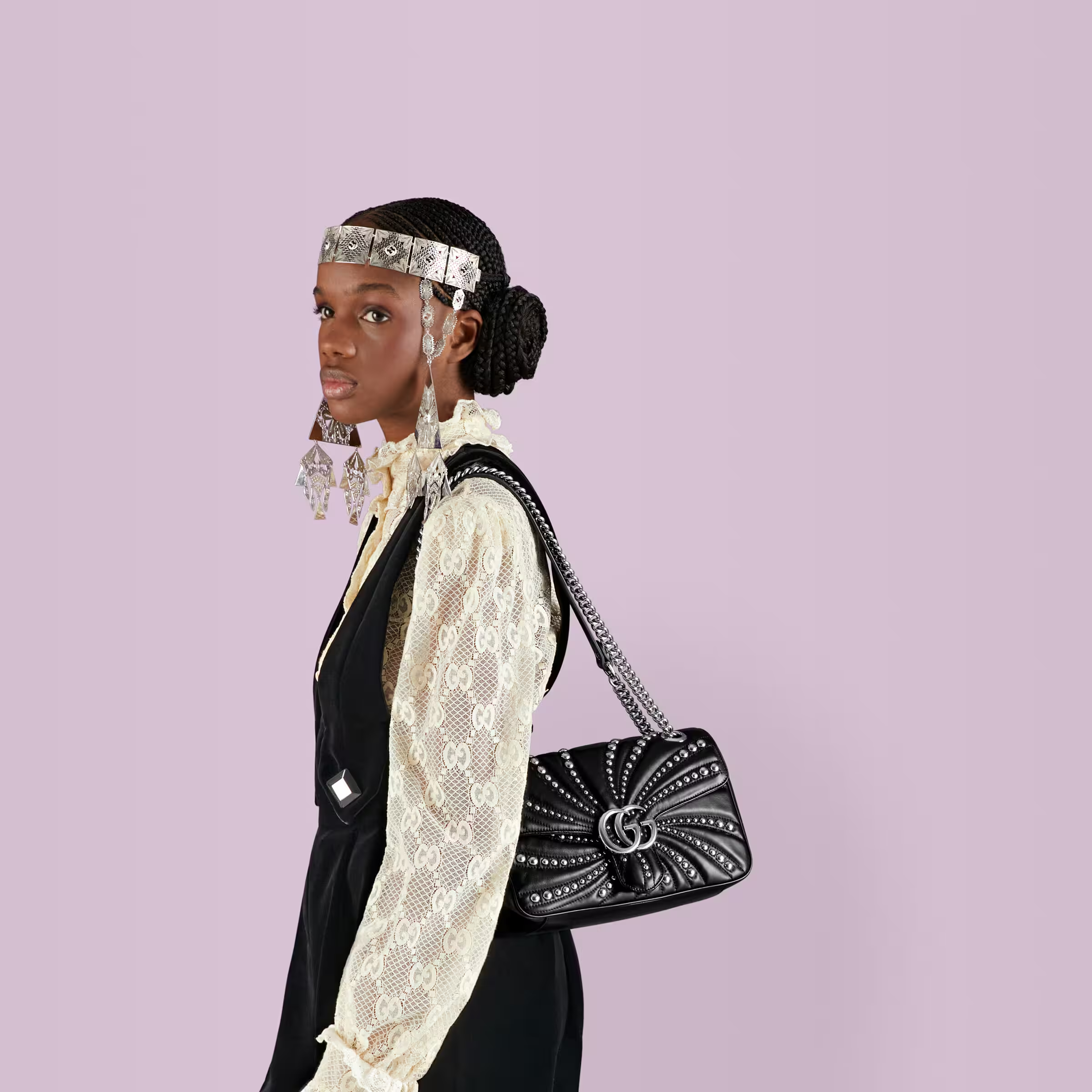 Heritage elements are reimagined with a contemporary twist throughout Cruise 2023 Gucci Cosmogonie. A nod to Gucci’s Founder, the Double G has appeared throughout the House’s collections season after season. Here, this GG Marmont is presented in black leather with a spiral stud detail, a nod to the rockstar theme that permeates the collection.
