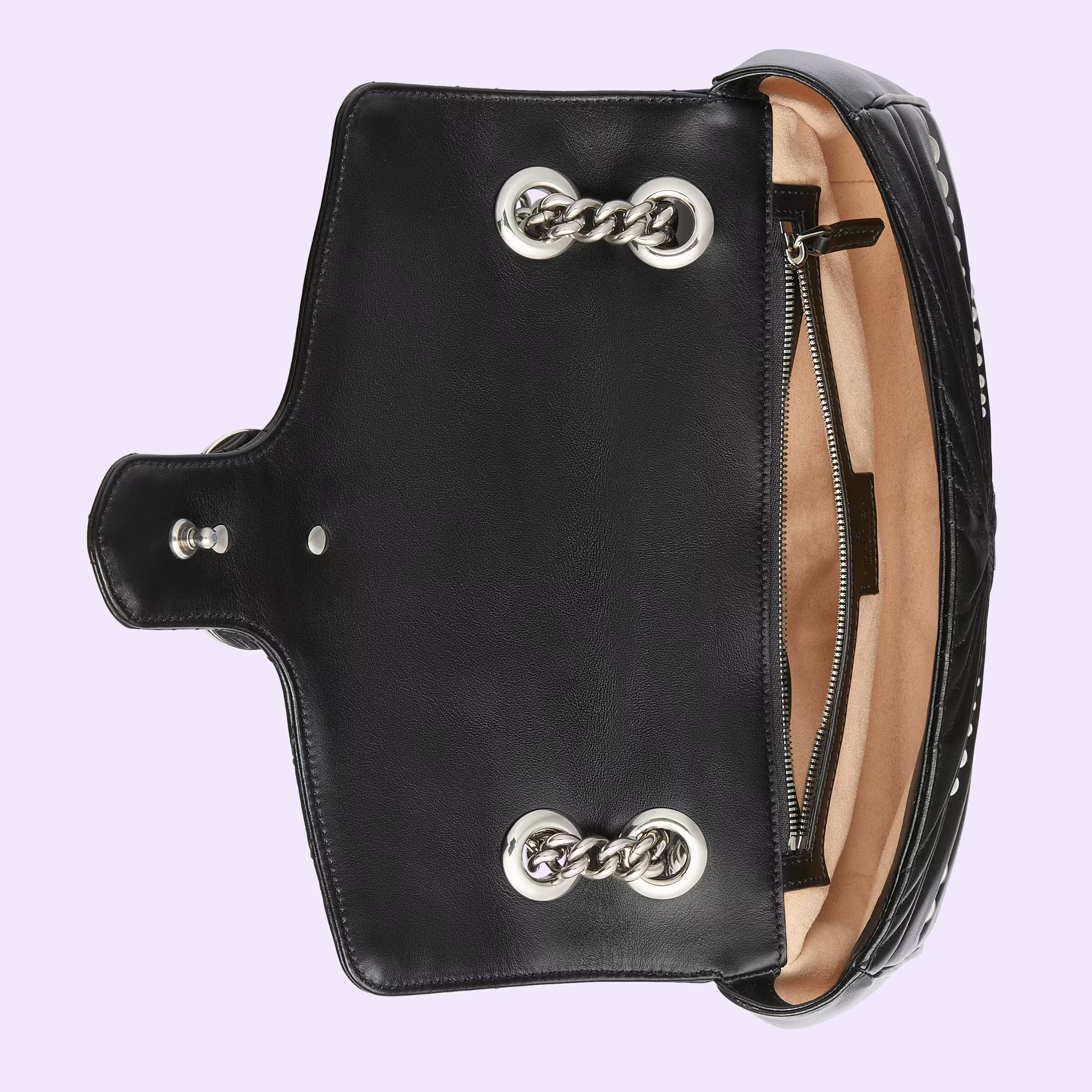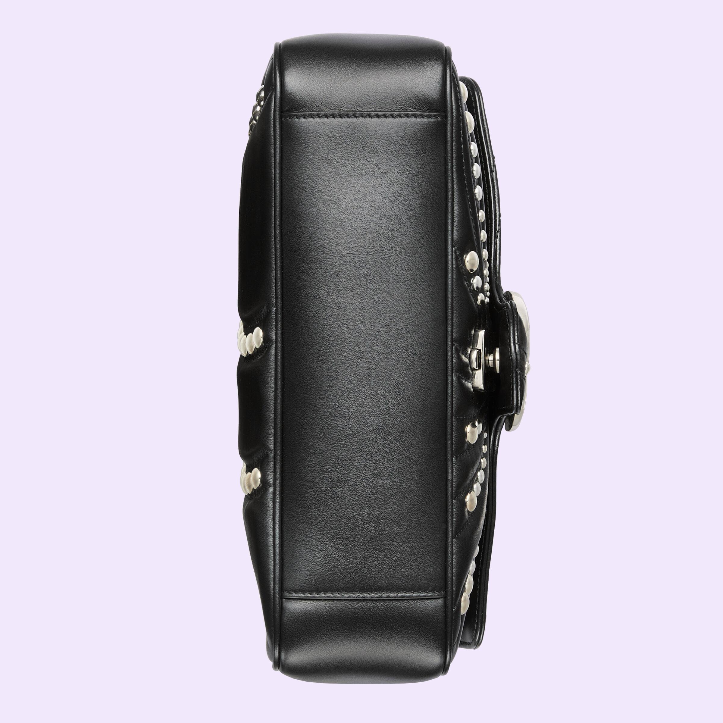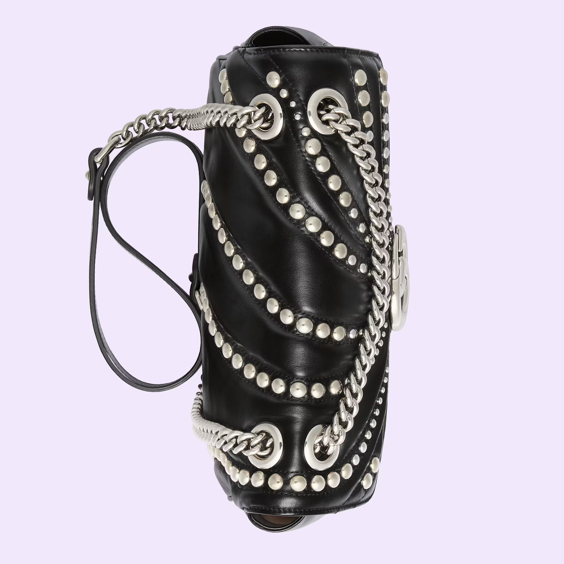 Heritage elements are reimagined with a contemporary twist throughout Cruise 2023 Gucci Cosmogonie. A nod to Gucci’s Founder, the Double G has appeared throughout the House’s collections season after season. Here, this GG Marmont is presented in black leather with a spiral stud detail, a nod to the rockstar theme that permeates the collection.