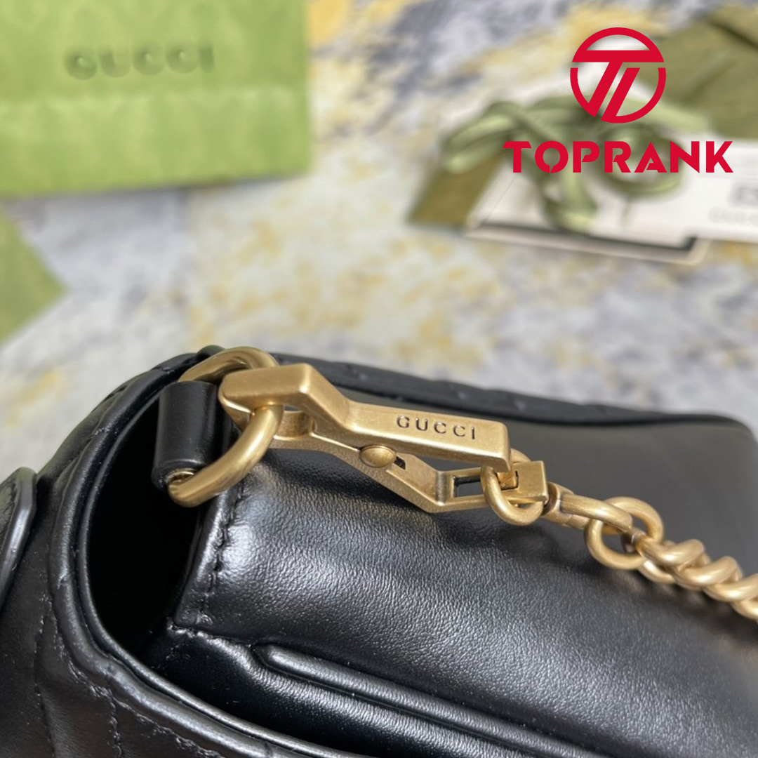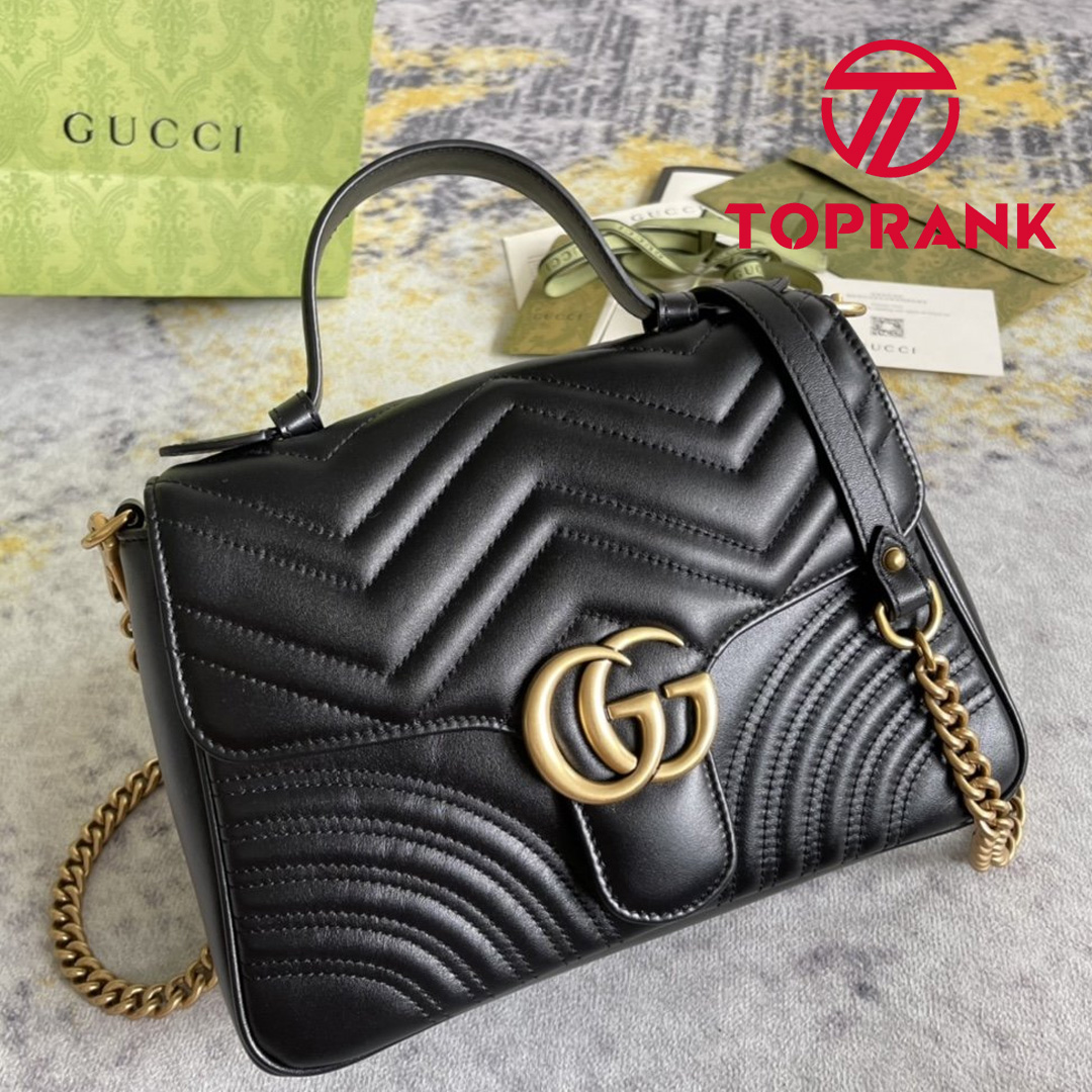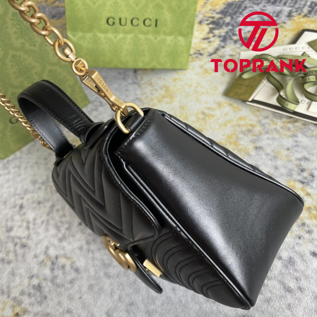 The small GG Marmont top handle bag has a softly structured shape and an oversized flap closure with Double G hardware. Made in matelassé chevron leather with a heart on the back.