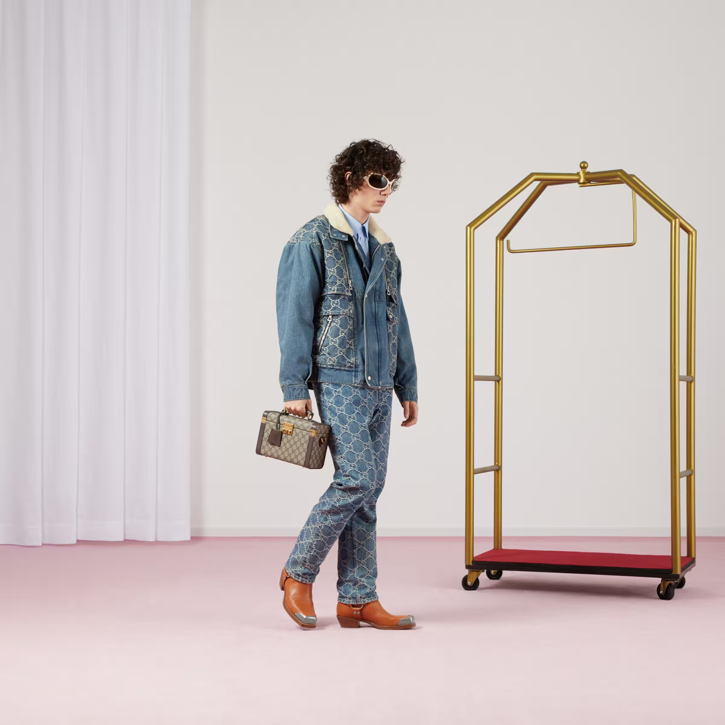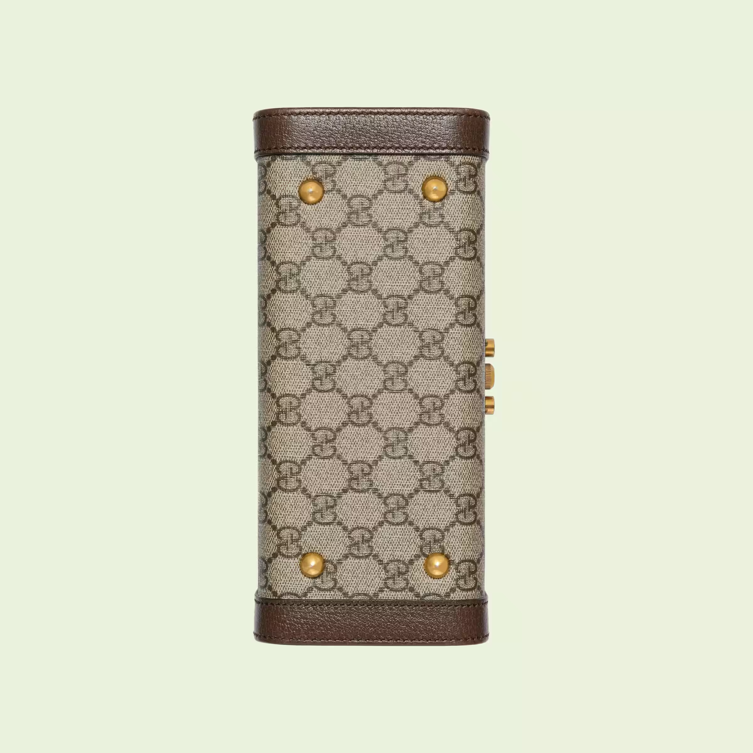Gucci Love Parade presents new iterations of vintage styles. This beauty case is crafted from the House’s GG monogram in beige and ebony Supreme canvas, complete with brown leather trim. The elegant design features a lock and key, while the top handle and shoulder strap allow for versatile ways to wear it. This item is part of Gucci’s MX, a selection that embraces freedom of expression and explores identity norms.