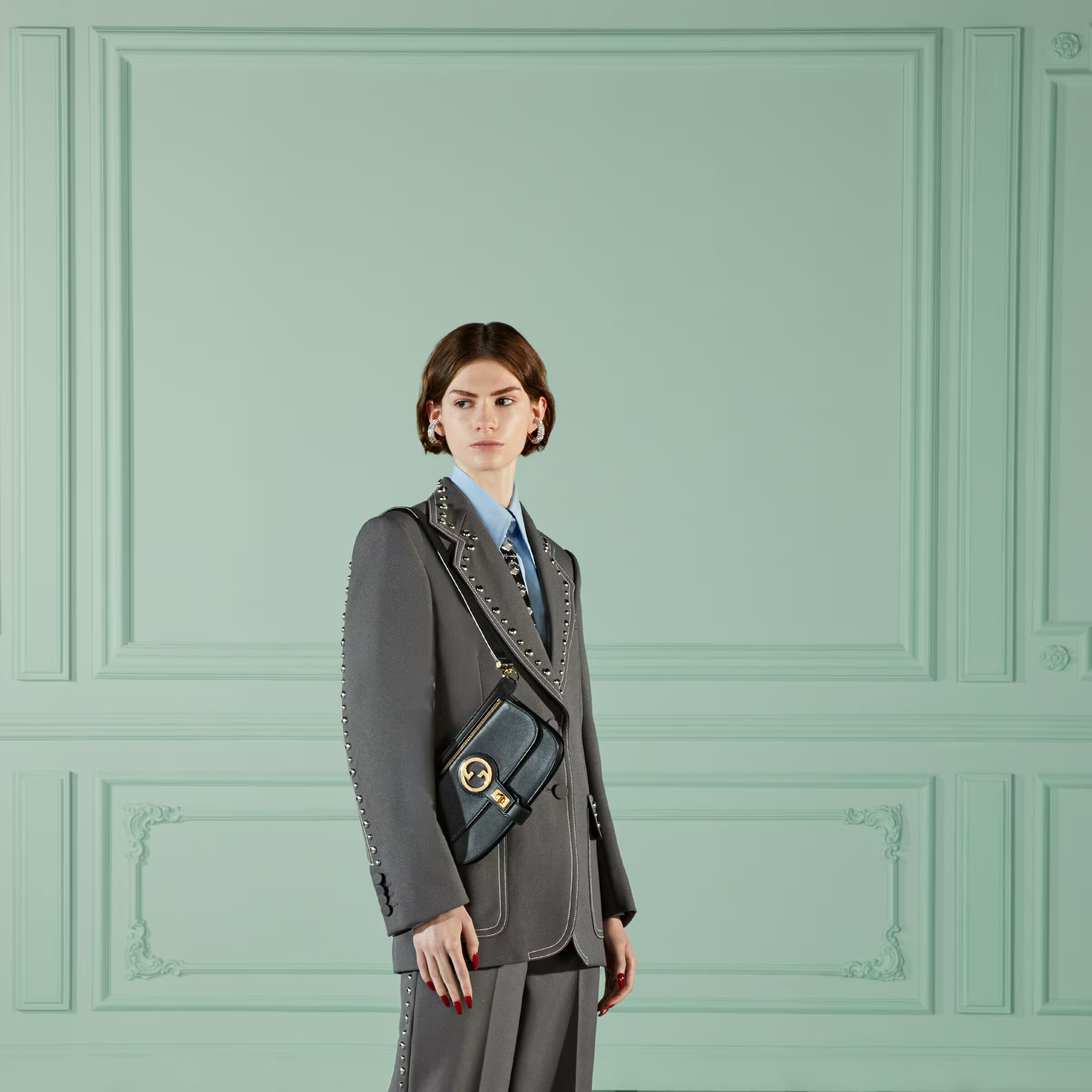 The Blondie hardware, a geometrically shaped version of the Interlocking G logo, continues as part of Exquisite Gucci. The gold-toned buckle adds a refined vintage feel to this new belt bag style in black leather, while the zip compartment reflects a modern versatility.
