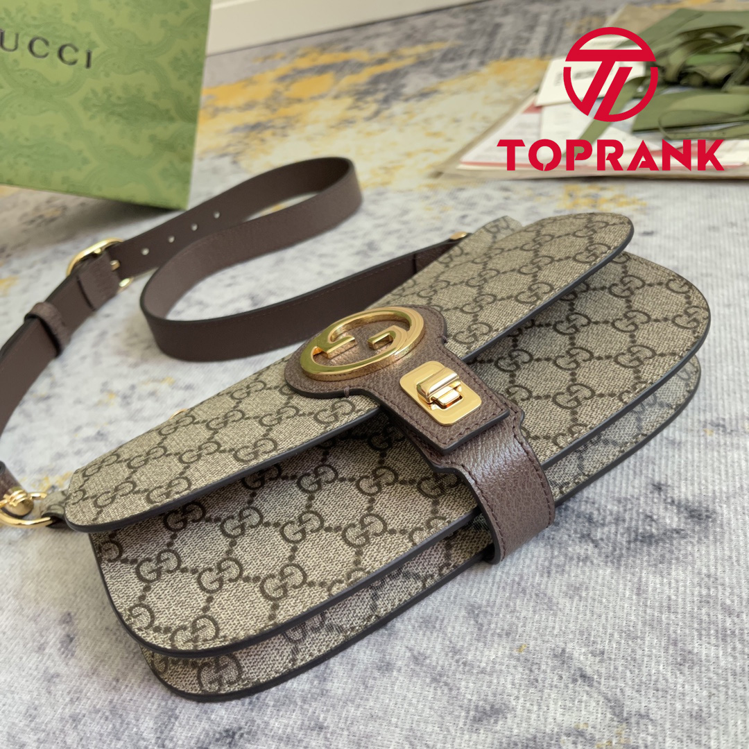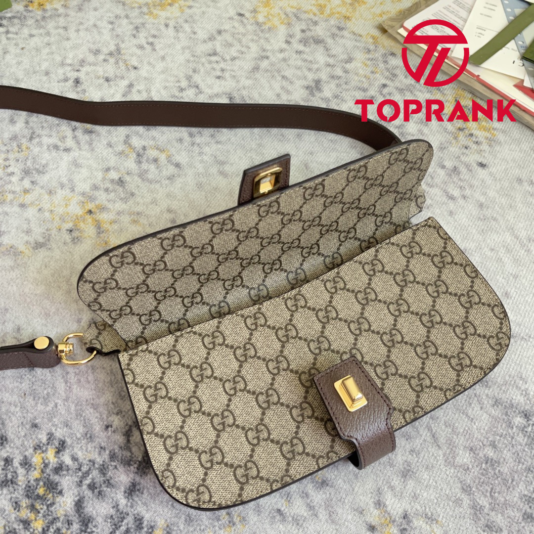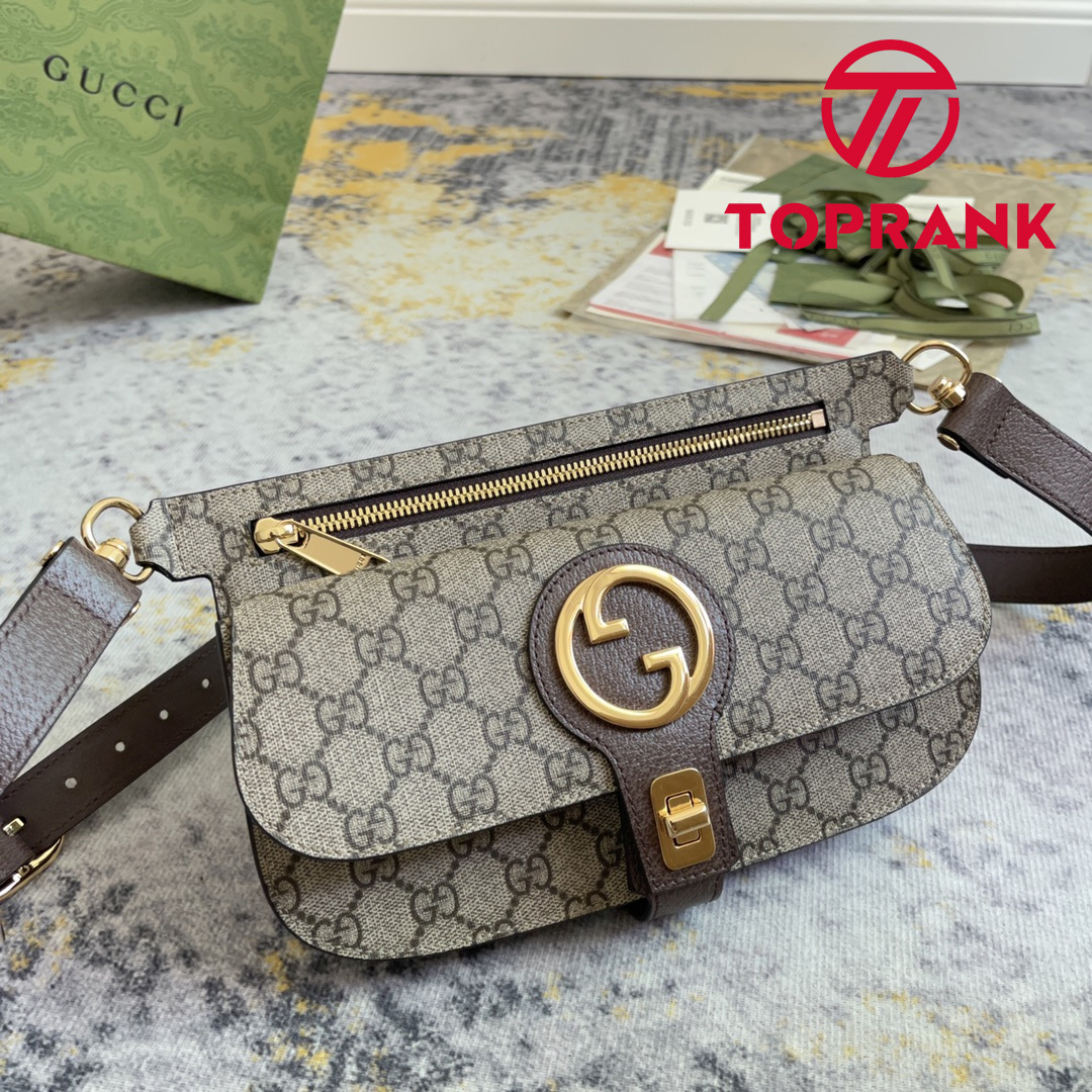 The Blondie hardware, a geometrically shaped version of the Interlocking G logo, continues as part of Exquisite Gucci. The gold-toned buckle adds a refined vintage feel to this new belt bag style in beige and ebony GG Supreme, while the zip compartment reflects a modern versatility.