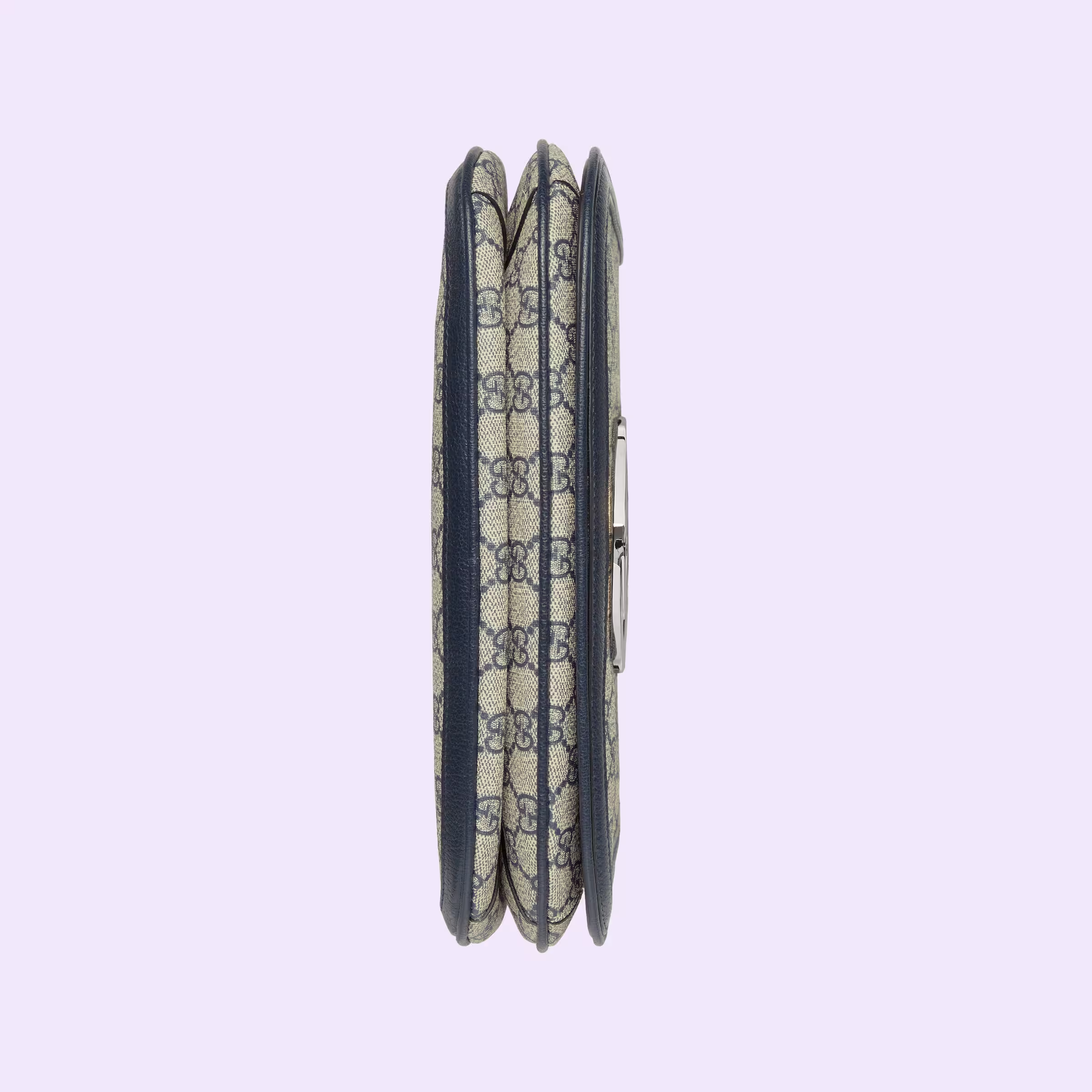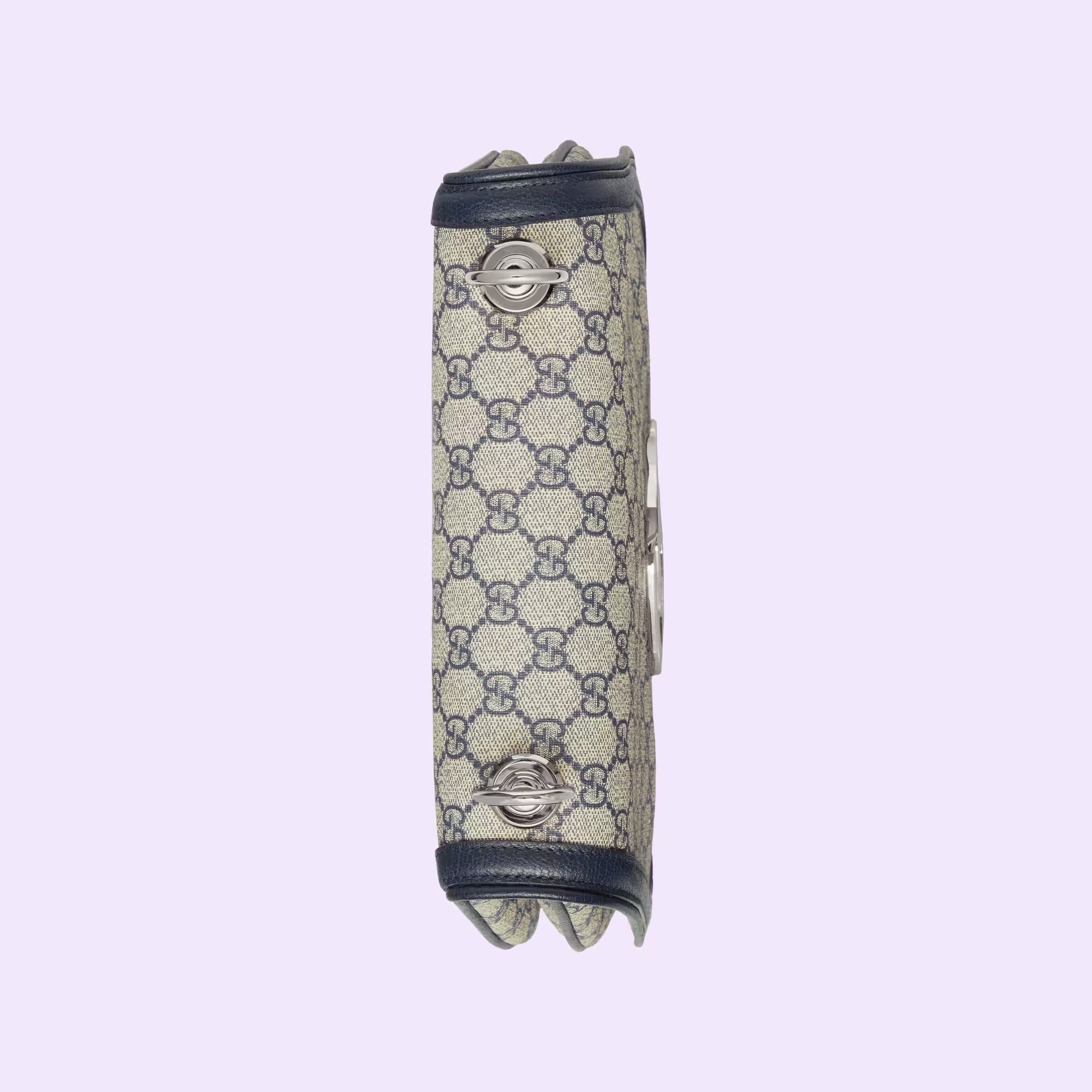 Coming from the House’s archives, a geometrically shaped version of the Interlocking G logo comes to the fore. The gold-toned hardware adds a defined vintage feel to the style, enriching the design with a timeless feel—mirroring the Hollywood glamour that shaped the fashion show. The top handle bag is completed by two interchangeable straps, one with stud details.