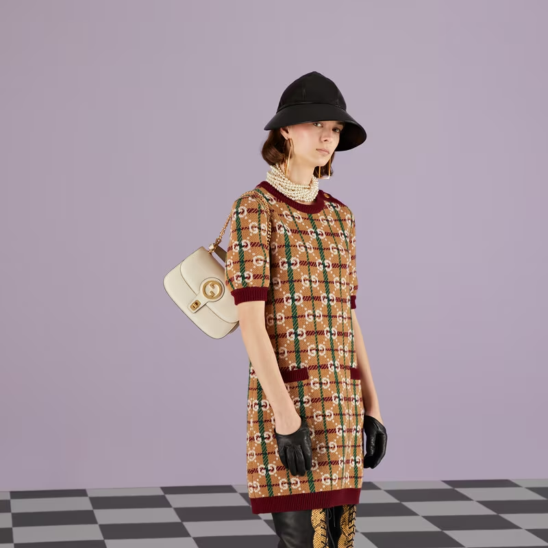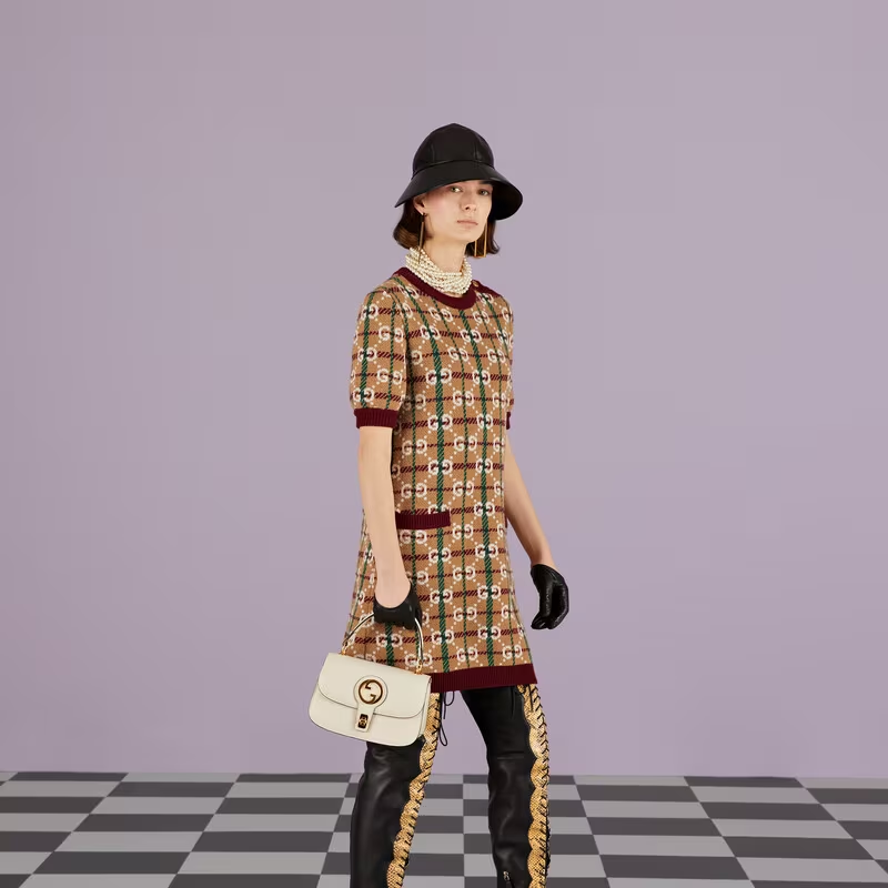 Taking inspiration from the House’s archives, a geometrically shaped version of the Round Interlocking G logo sits atop this small top handle bag. The gold-toned hardware adds a defined vintage feel to the style, enriching the design with a timeless feel. The white leather style is completed by two interchangeable shoulder straps, in tonal leather or gold-toned metal chain.