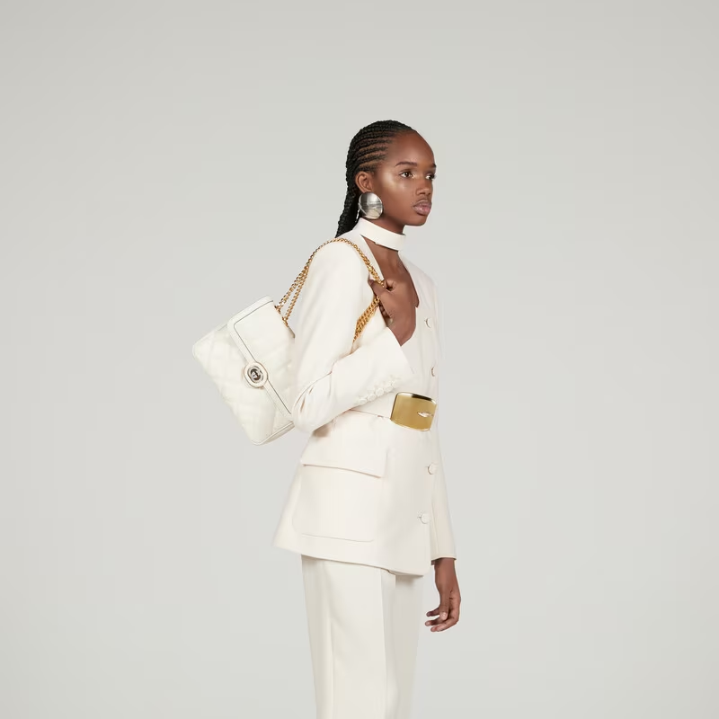 Fascinated with the past, Gucci continues to expand its horizons by revisiting classic silhouettes and refined materials. With their quilted design, the new bags highlight emblematic symbols from the archive for a retro feel, such as Interlocking G hardware on the flap closure, ’70s-inspired leather trim, and a chain shoulder strap, like this shoulder bag.