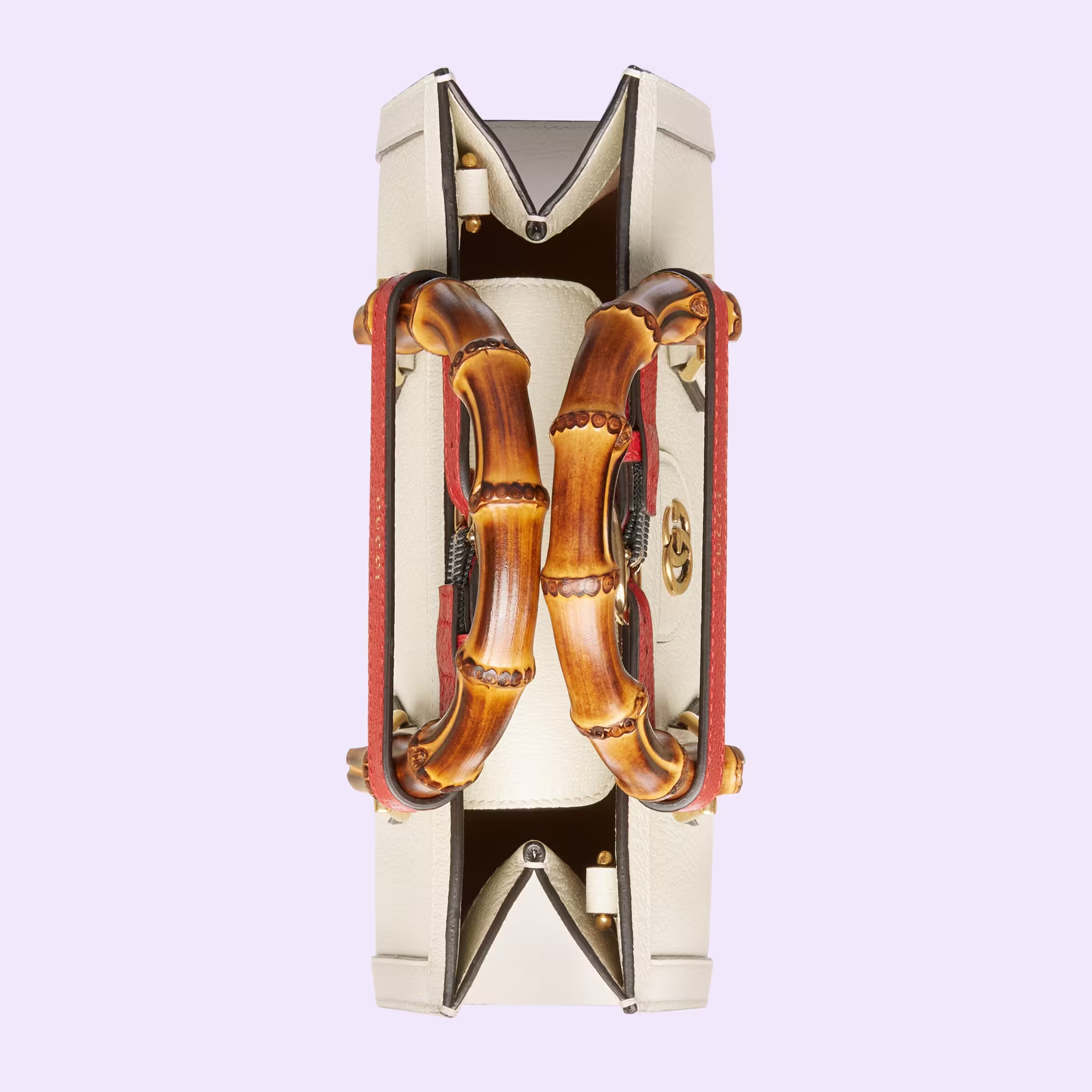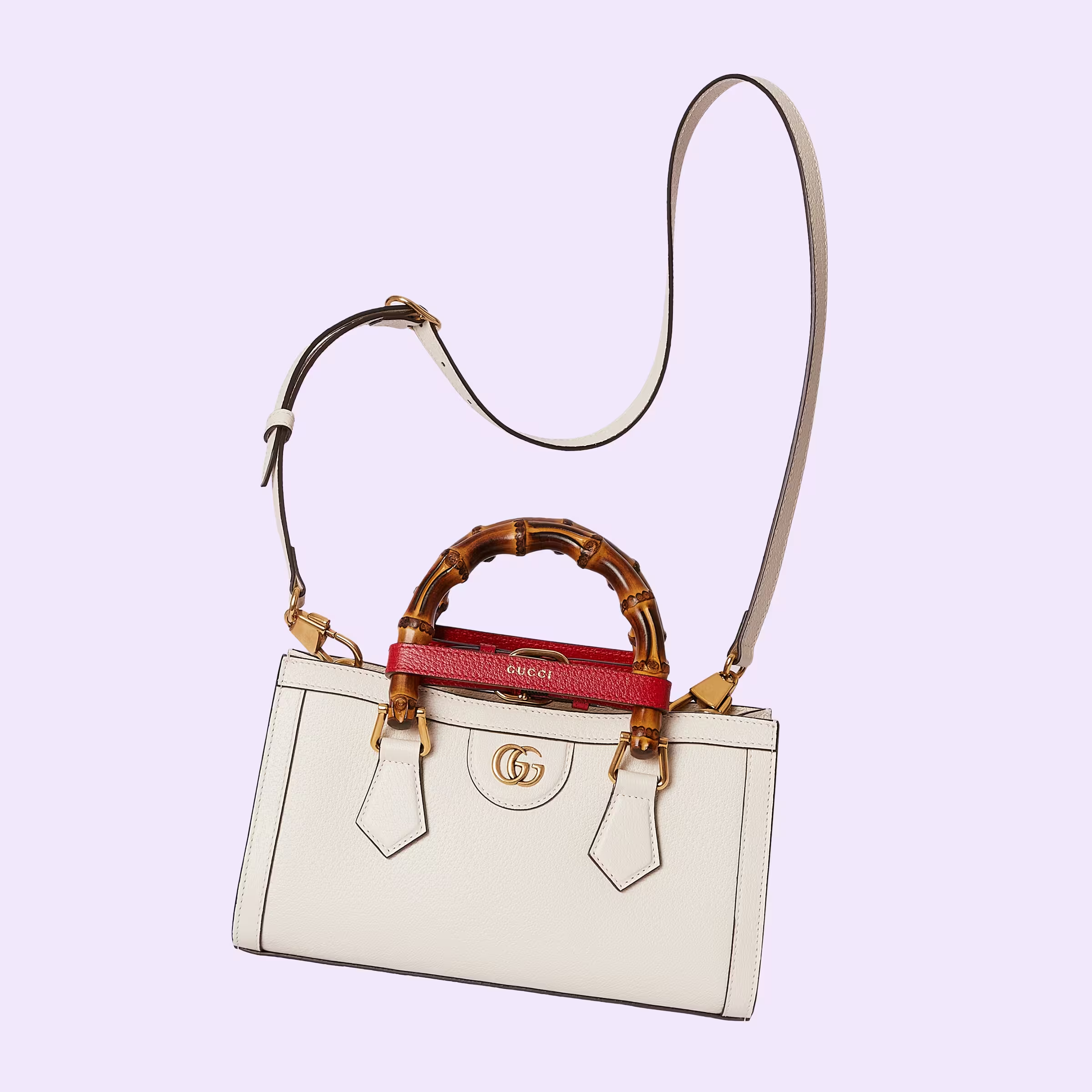 A new shape for Gucci Cosmogonie, the Gucci Diana continues to combine recognizable elements of the House with the bamboo handles and Double G hardware. Crafted from white leather, the accessory is further accentuated by two decorative leather belts, a playful reference to the bands used to keep handles in shape.