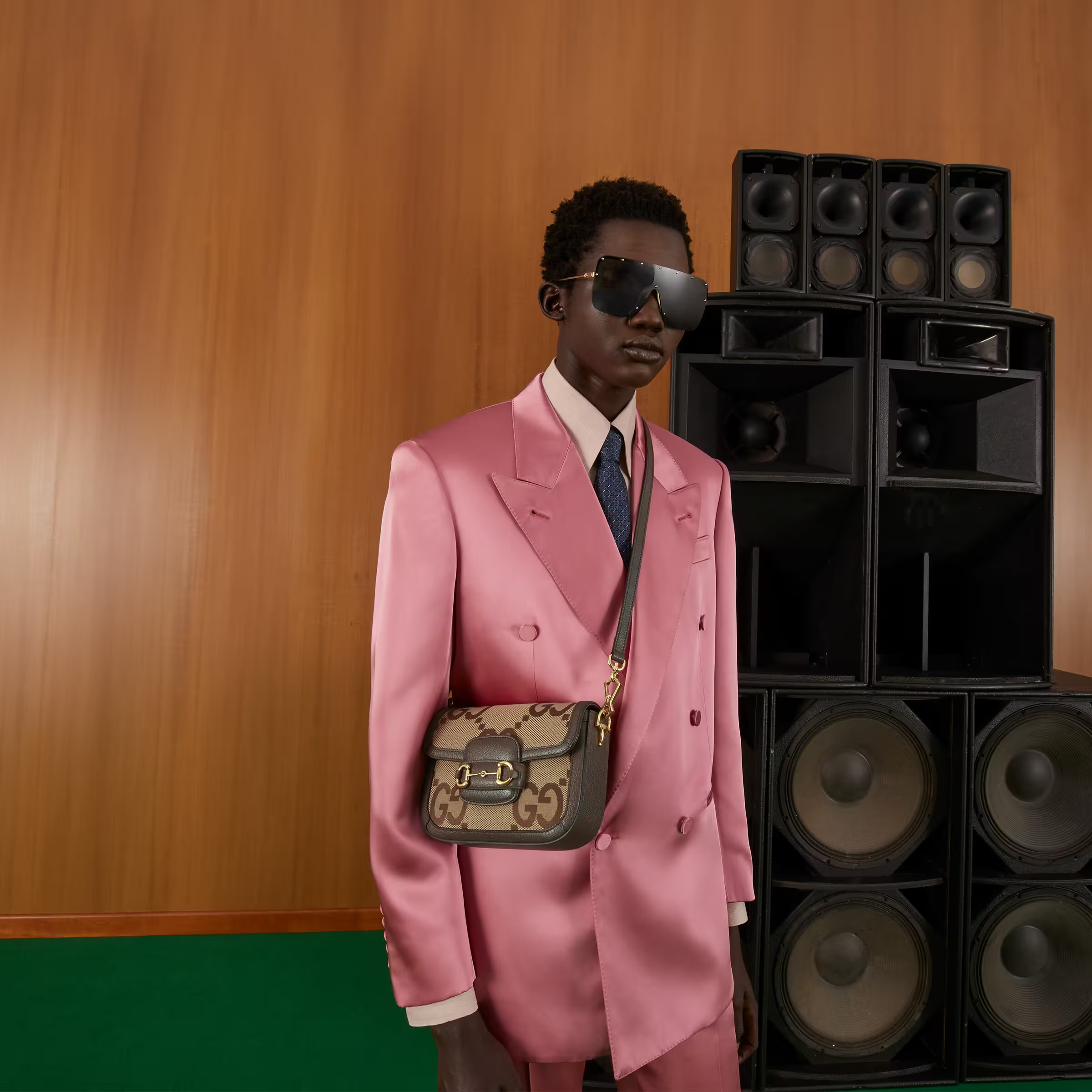 Instantly recognizable emblems of the brand, logos enrich designs in new and unexpected ways. Behind every logo lies the tradition and value of the House, an everlasting medium one can wear again and again. Following the idea of constant change and experimentation, different iterations of the logo have been presented each collection. The jumbo GG, a reimagined version of the historic monogram, defines this Gucci Horsebit 1955 mini bag.