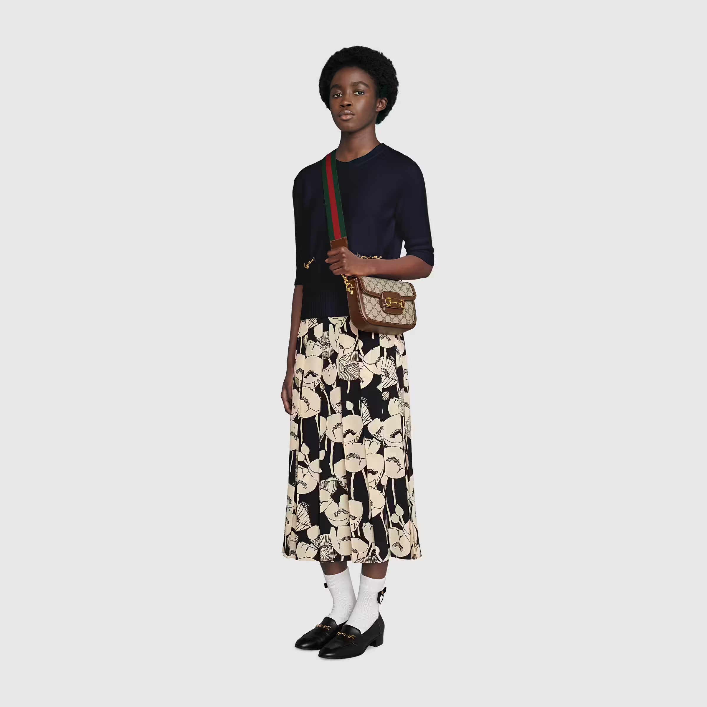 Petite versions of the Gucci Horsebit 1955 add a hybrid twist to the vintage inspired line. Enriched with two different shoulder straps, the mini bag’s character transforms from understated elegance with a tonal leather strap to a strong logo feel thanks to a red and green Web option. The accessory is presented in monogram canvas with a brown leather trim.