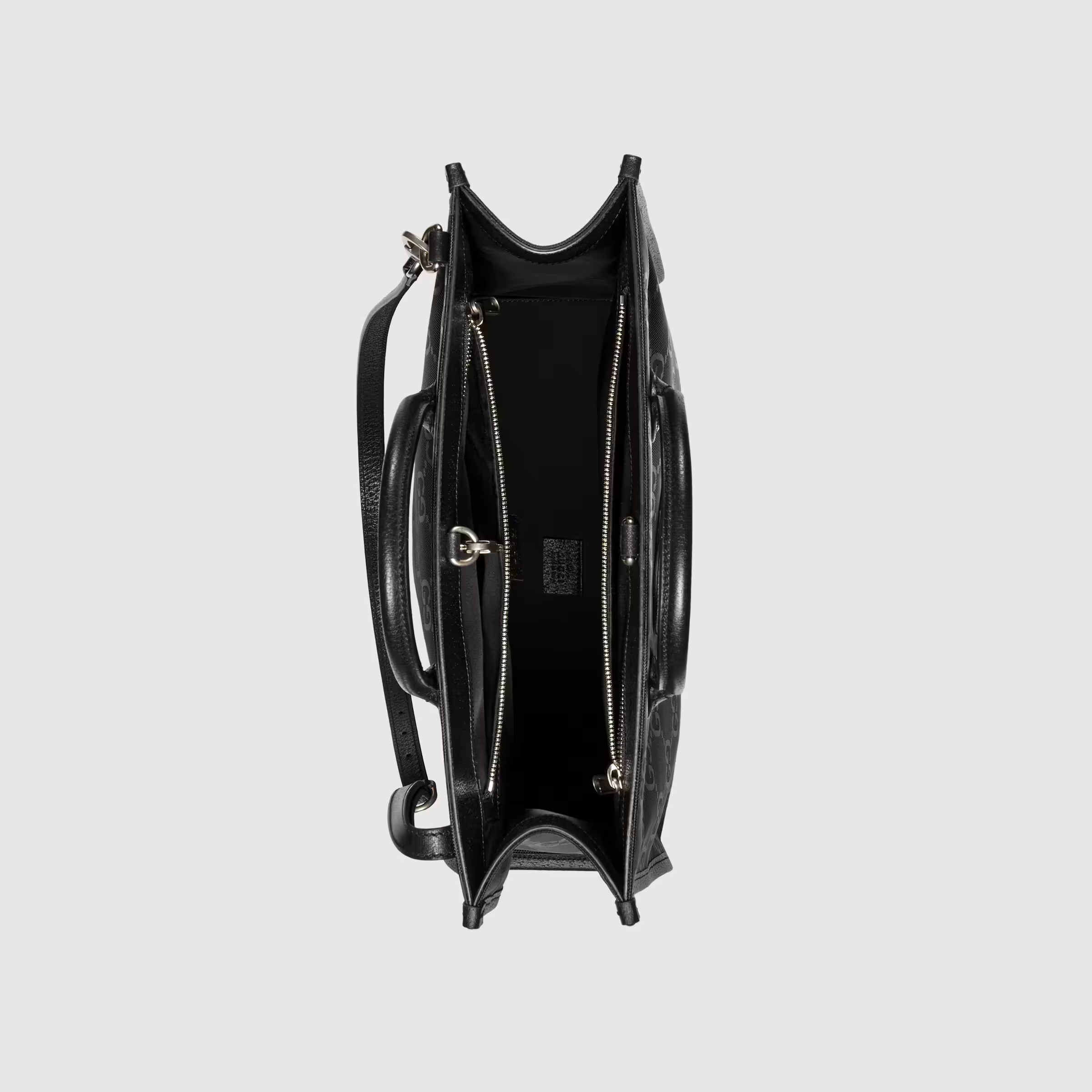 A line of accessories and ready-to-wear is presented for Pre-Fall 2020 made from recycled materials and trims, supporting the House’s commitment to sustainability. Gucci Off The Grid is the first collection from Gucci Circular Lines—a concept created to support the House’s vision for circular production. Designed for those mindful of their environmental impact, Gucci Off The Grid uses recycled, organic, bio-based and sustainably sourced materials. Regenerated nylon, crafted using recycled sewing thread and trims displays the GG pattern against an opaque background in black. Crafted into a long double handled tote bag, the shape is finished with an optional shoulder strap that can be detached on one side and stored within the bag.