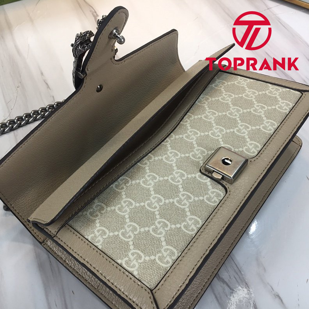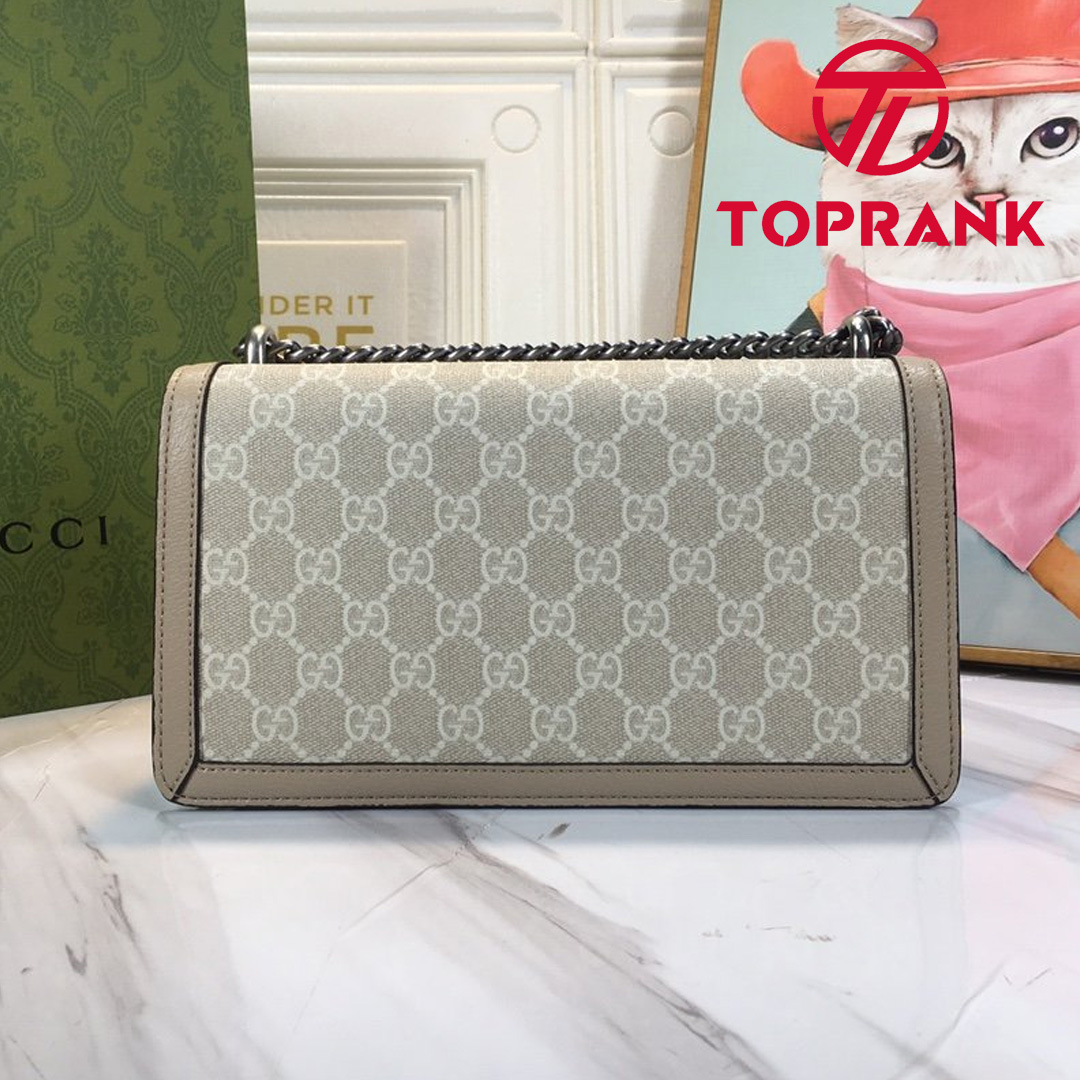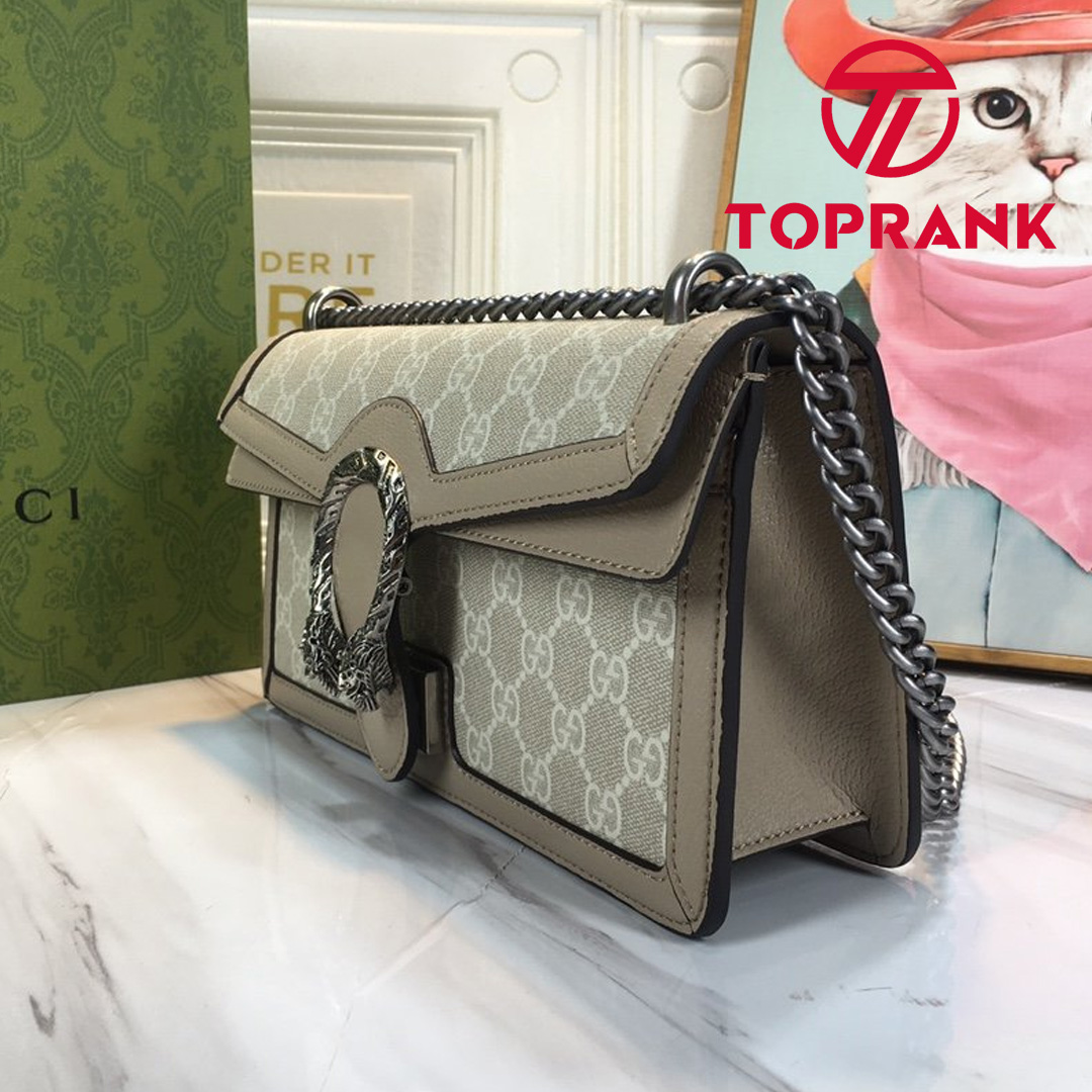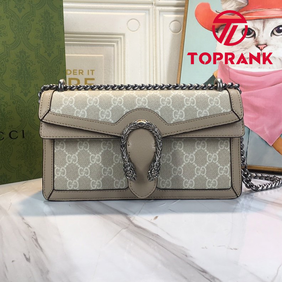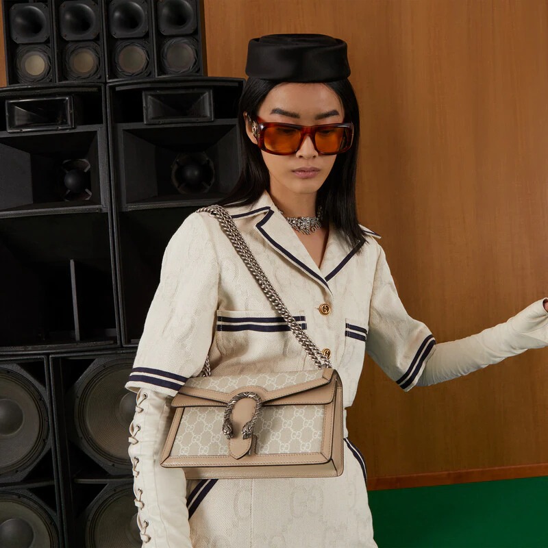 A heritage material from the archive, GG Supreme has been reimagined in Gucci Love Parade in different color combinations and combined with contemporary as well as classic styles. The Dionysus is presented in a beige and white variation of the signature material with a tonal trim. Originally a play on a ’30s design, the canvas speaks to the historical narrative that runs throughout the collection.