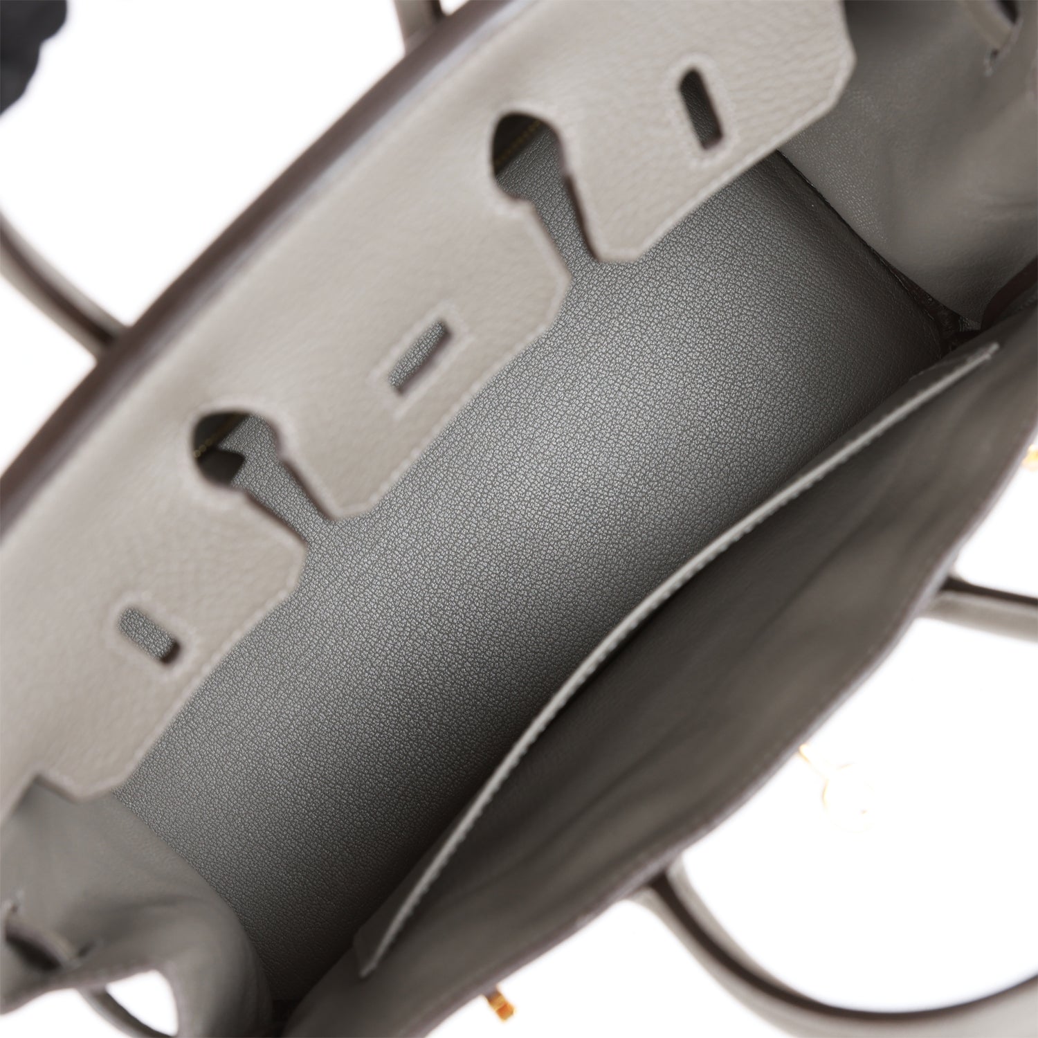 This Birkin is in Gris Meyer togo leather with gold hardware and has tonal stitching, front flap, two straps with center toggle closure, clochette with lock and two keys and double rolled handles.