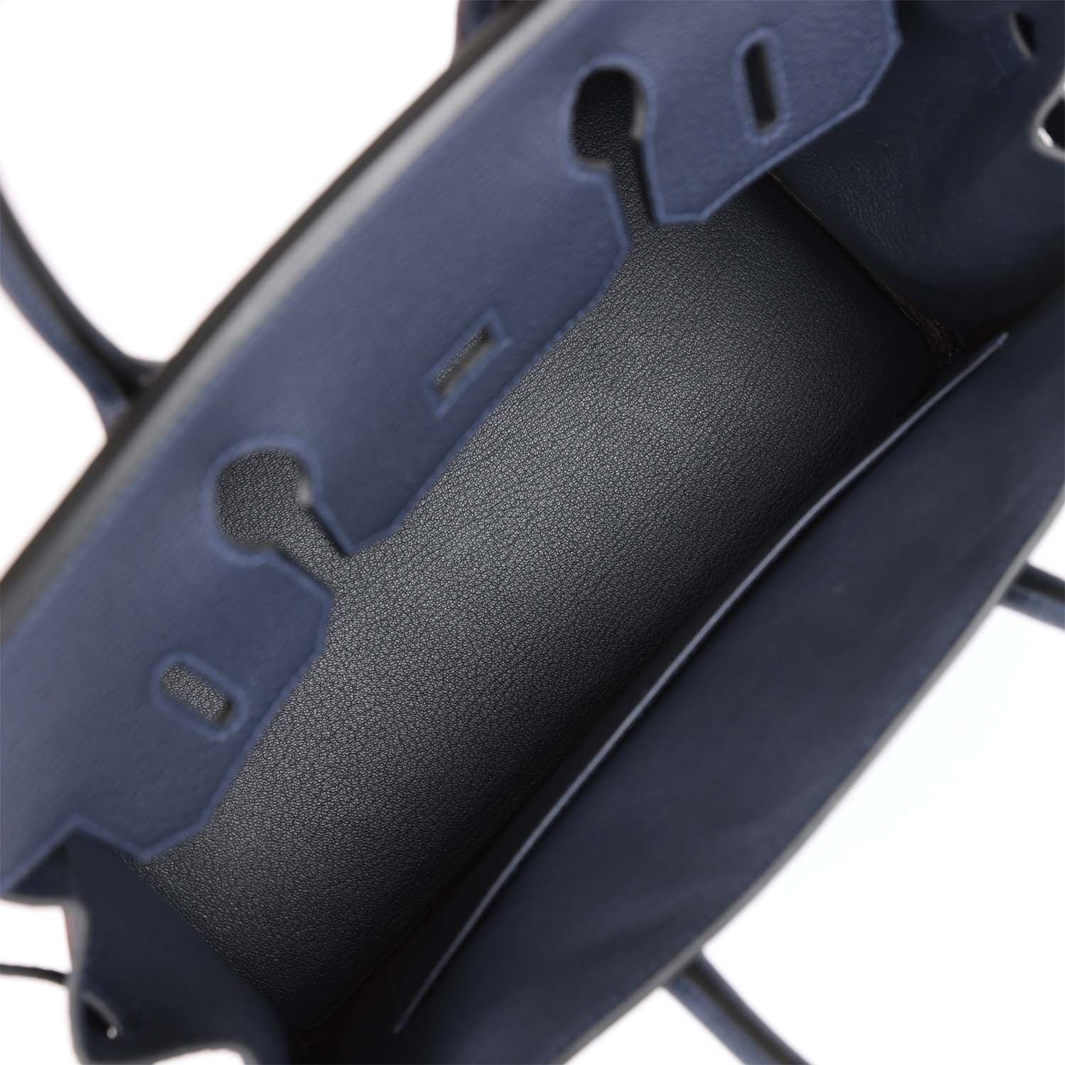 The interior is lined with?Bleu Nuit chevre and has one zip pocket with an Hermes engraved zipper pull and an open pocket on the opposite side.