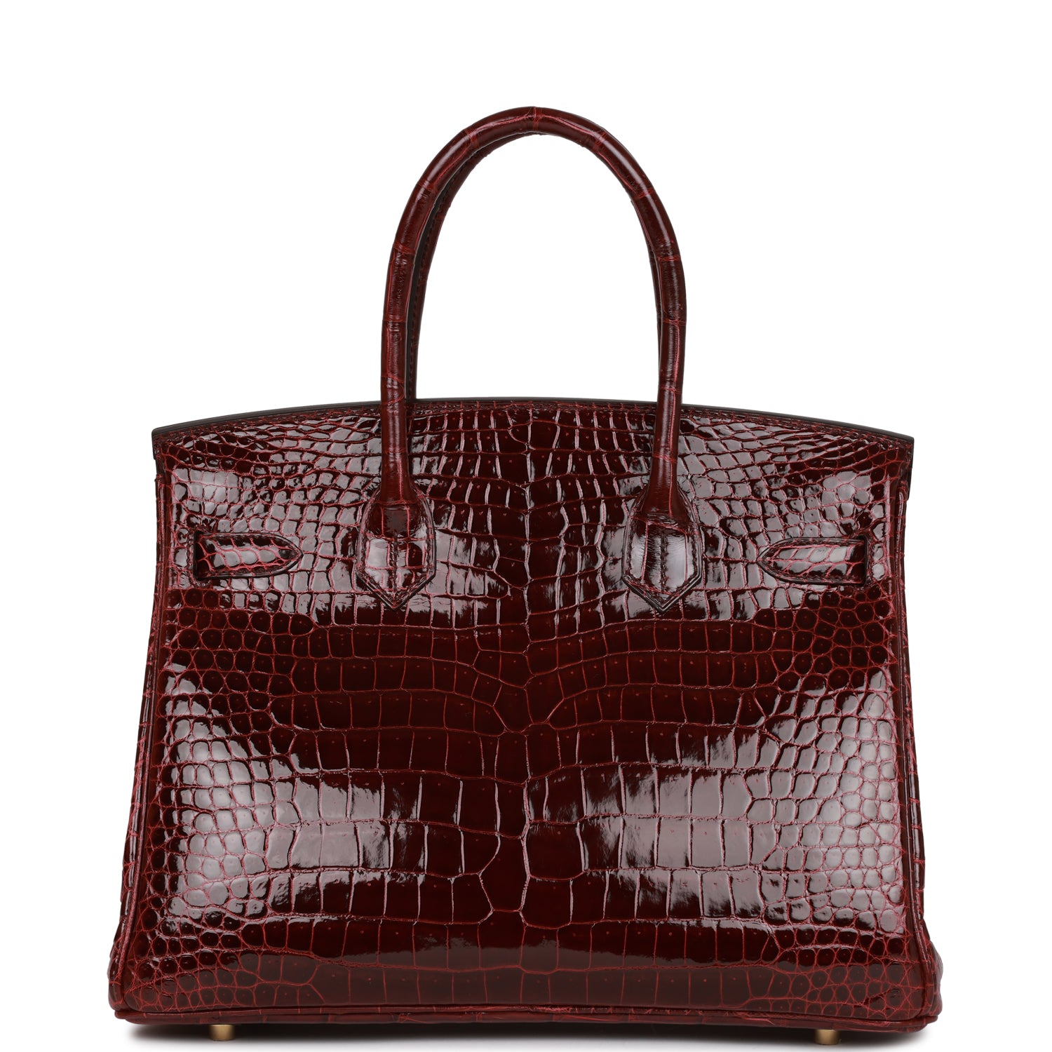 This Birkin is in Bordeaux shiny Porosus crocodile with gold hardware and has tonal stitching,front flap, two straps with center toggle closure, clochette with lock and two keys, and double rolled handles.