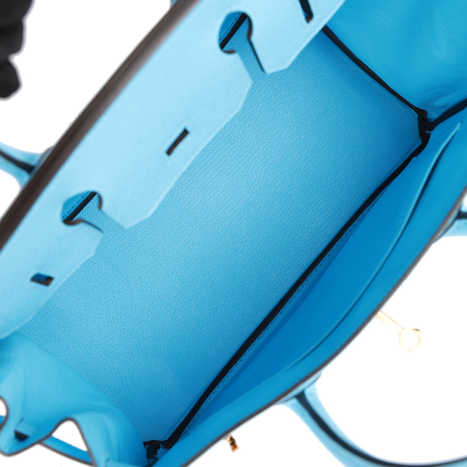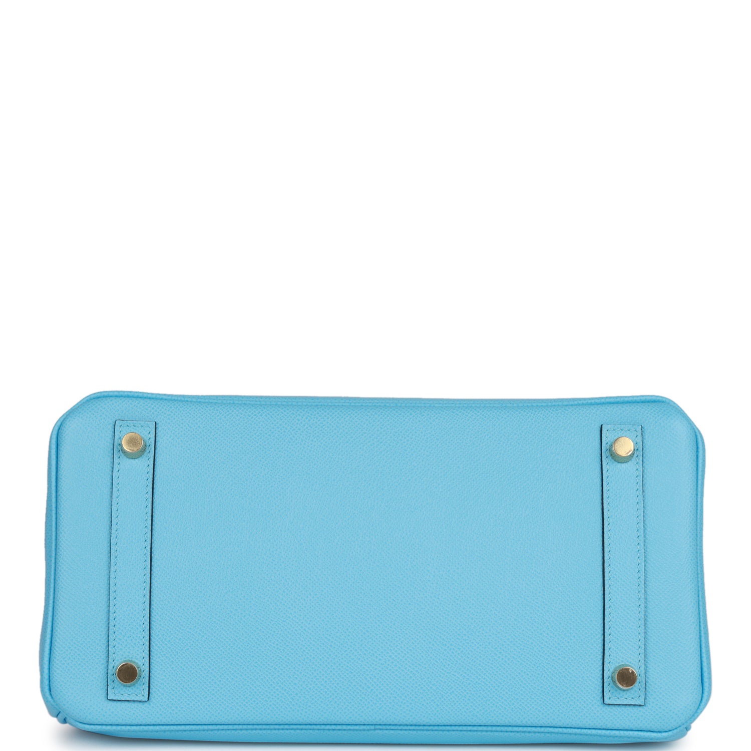 This Birkin is in Celeste epsom leather with gold hardware and has tonal stitching, front flap, two straps with center toggle closure, clochette with lock and two keys, and double rolled handles.