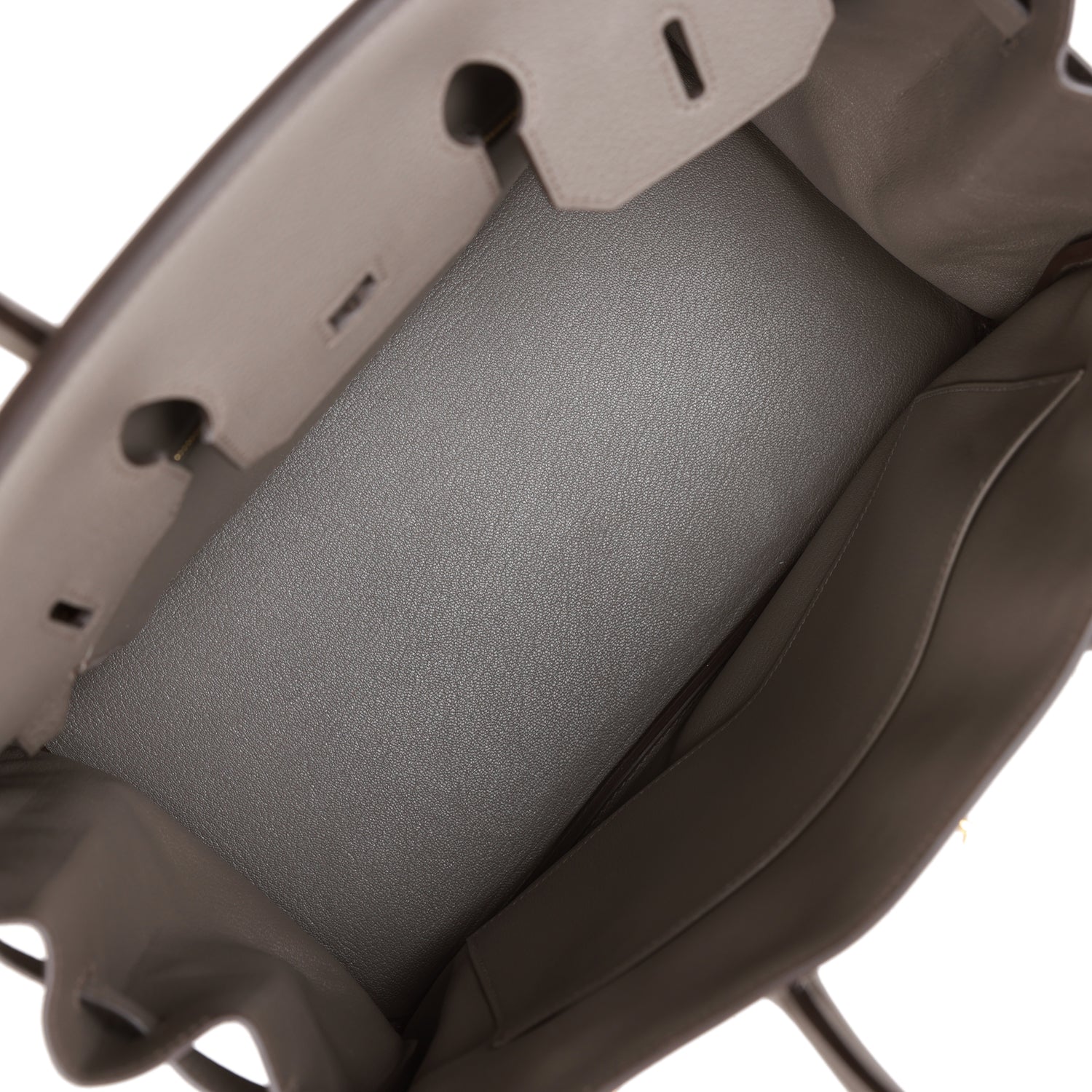 This Birkin is in Gris Etain togo leather with gold hardware and has tonal stitching, two straps with front toggle closure, clochette with lock and two keys and double rolled handles.