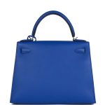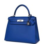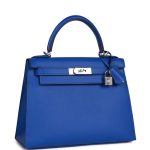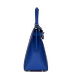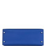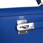 This Kelly Sellier is of Bleu Royal epsom leather with palladium hardware and has tonal stitching, a front toggle closure, a clochette with lock and two keys, a single rolled handle and an optional shoulder strap.