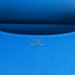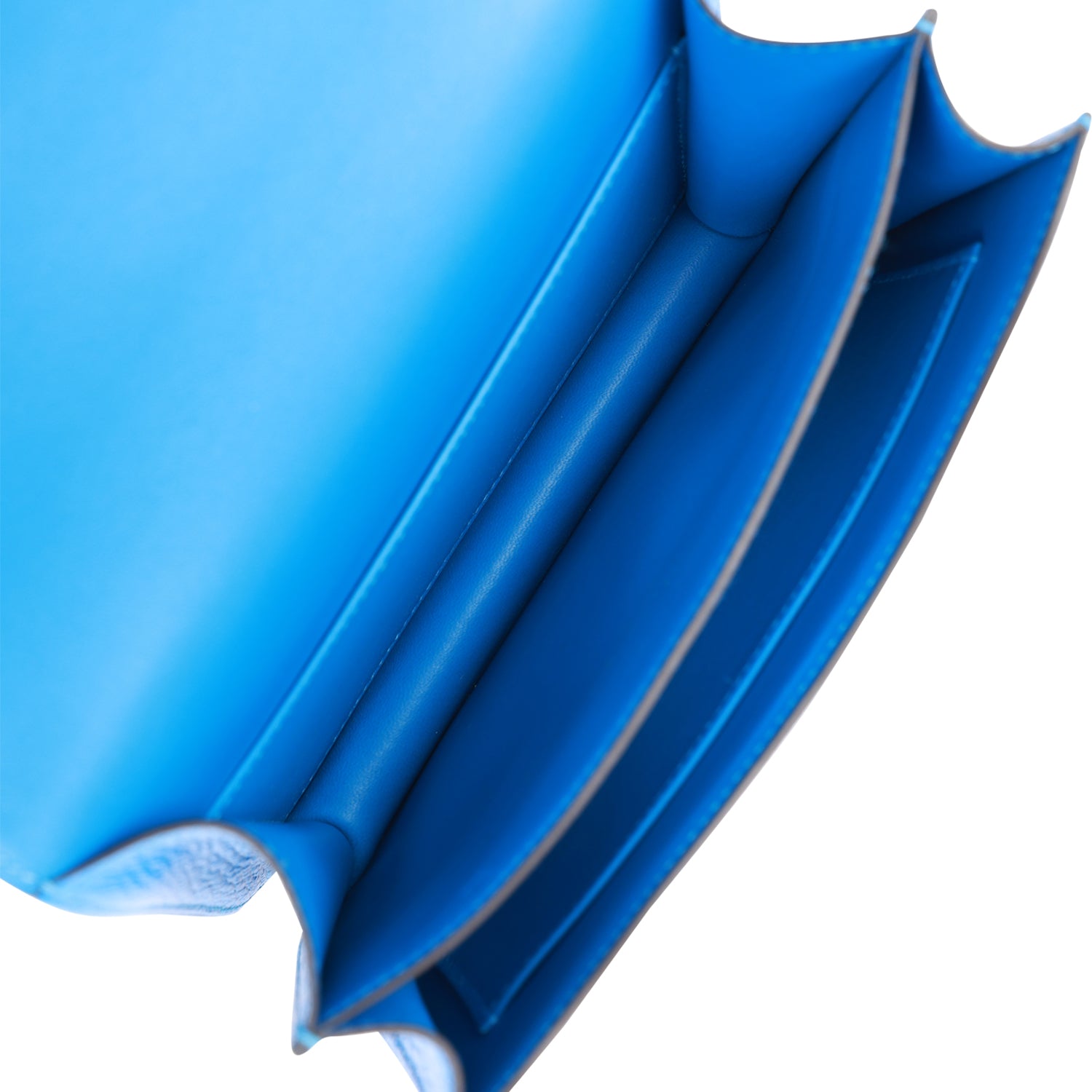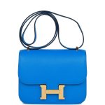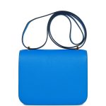 This Constance is in?Bleu?Hydra chevre leather?with?gold hardware and has tonal stitching, a?metal “H” snap lock closure and adjustable shoulder strap.