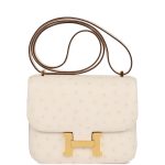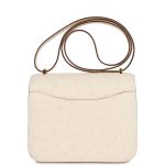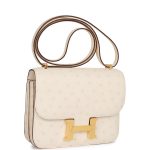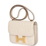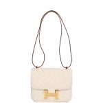 This Constance is of?Nata ostrich with?gold hardware and features?tonal stitching, a “H” snap lock closure, and an adjustable shoulder strap.