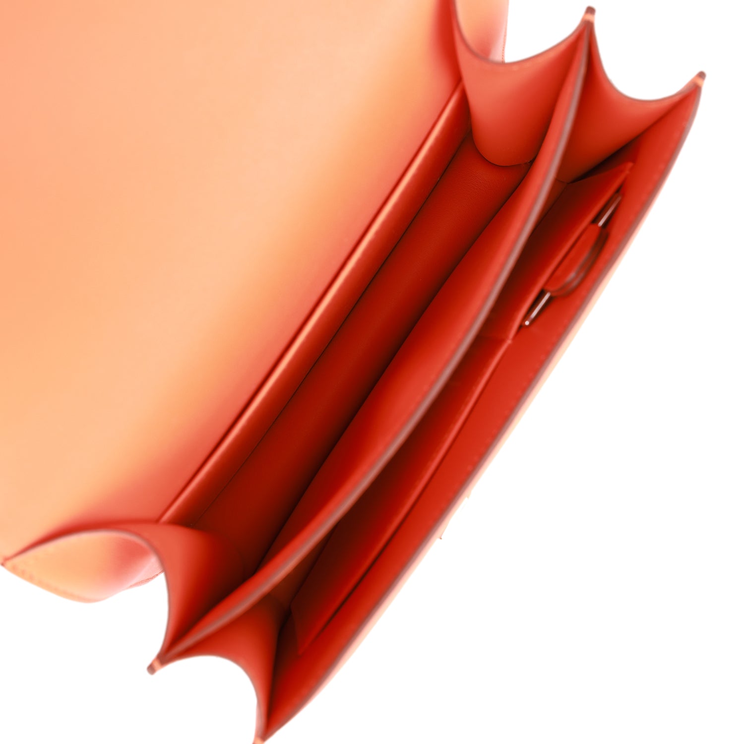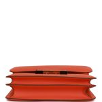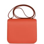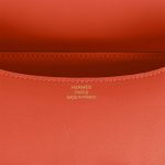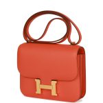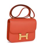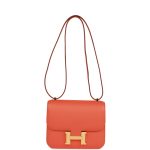 This Constance is in?Orange?swift leather?with?gold hardware and has?tonal stitching, a?metal “H” snap lock closure and adjustable shoulder strap.
