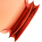 The interior is lined with Orange lambskin and has an open pocket on the front wall, a center divide, and a slit pocket on the back wall.