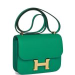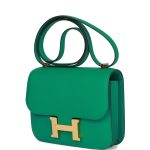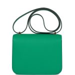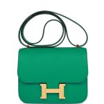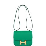 This Constance is in?Vert Jade epsom leather?with gold hardware and has?tonal stitching, a?metal “H” snap lock closure and adjustable shoulder strap.