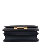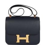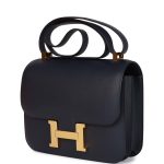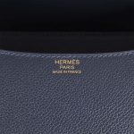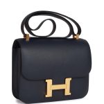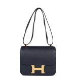 This Constance is in?Bleu Nuit evercolor leather with gold hardware and has?tonal stitching, a metal “H” snap lock closure, and adjustable shoulder strap.