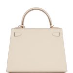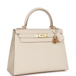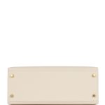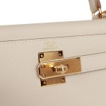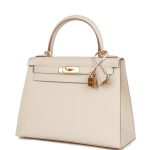 This Kelly, in the Sellier style, is in Craie epsom leather with gold hardware and has tonal stitching, two straps with front toggle closure, clochette with lock and two keys, single rolled handle and removable shoulder strap.