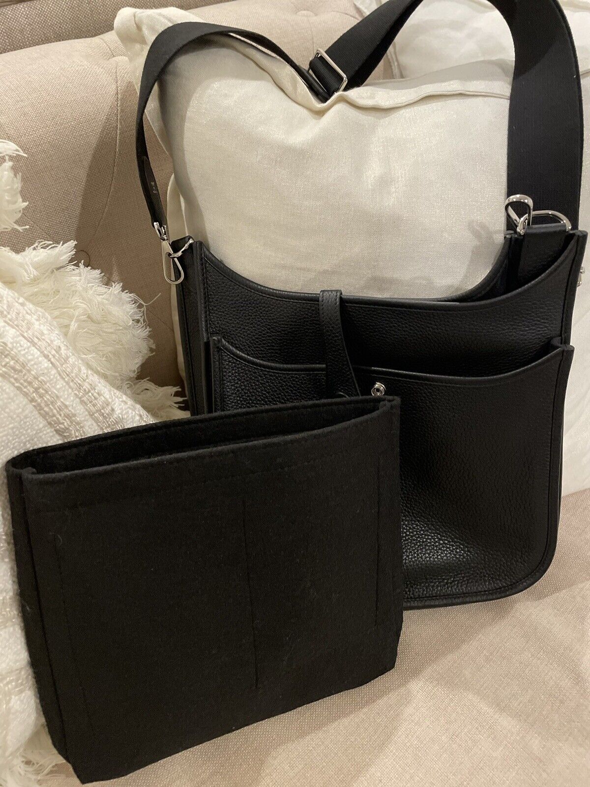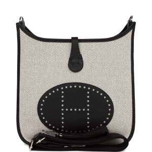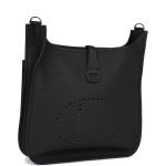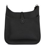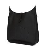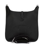 This Evelyne is in Black clemence leather with palladium hardware and has tonal stitching, pull tab top closure and Black removable canvas and leather shoulder/crossbody strap.
