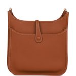 This Evelyne is in Gold clemence leather with gold hardware and has contrast stitching, pull tab top closure and gold removable canvas and leather shoulder/crossbody strap.