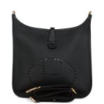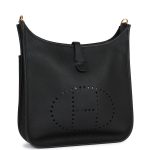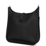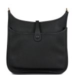 This Evelyne is in?Black clemence leather with?gold hardware and has?tonal stitching, pull tab top closure and?black removable canvas and leather shoulder/crossbody strap.